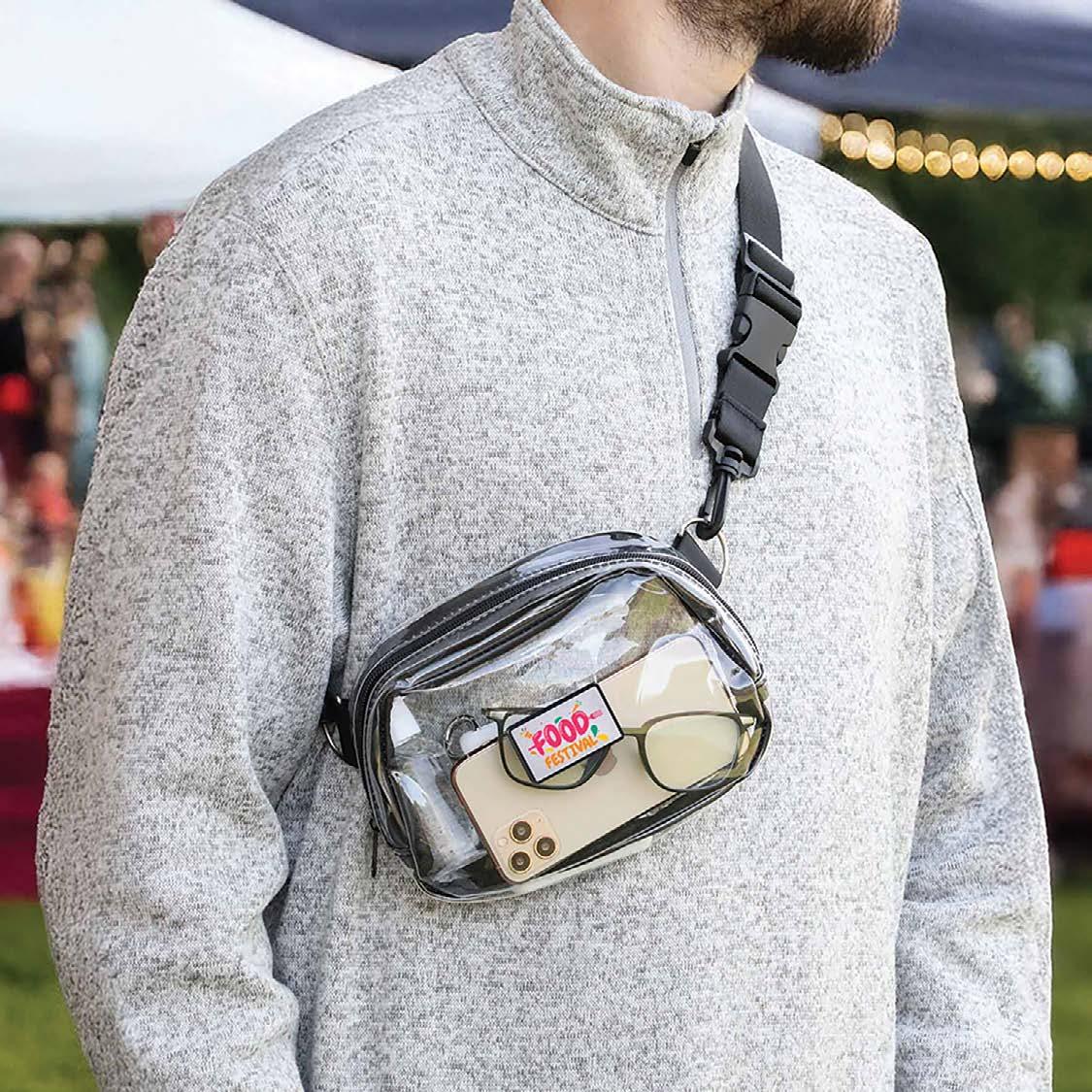 Stadium-approved clear crossbody pack with two compartments and an adjustable strap for versatile, handsfree wear.