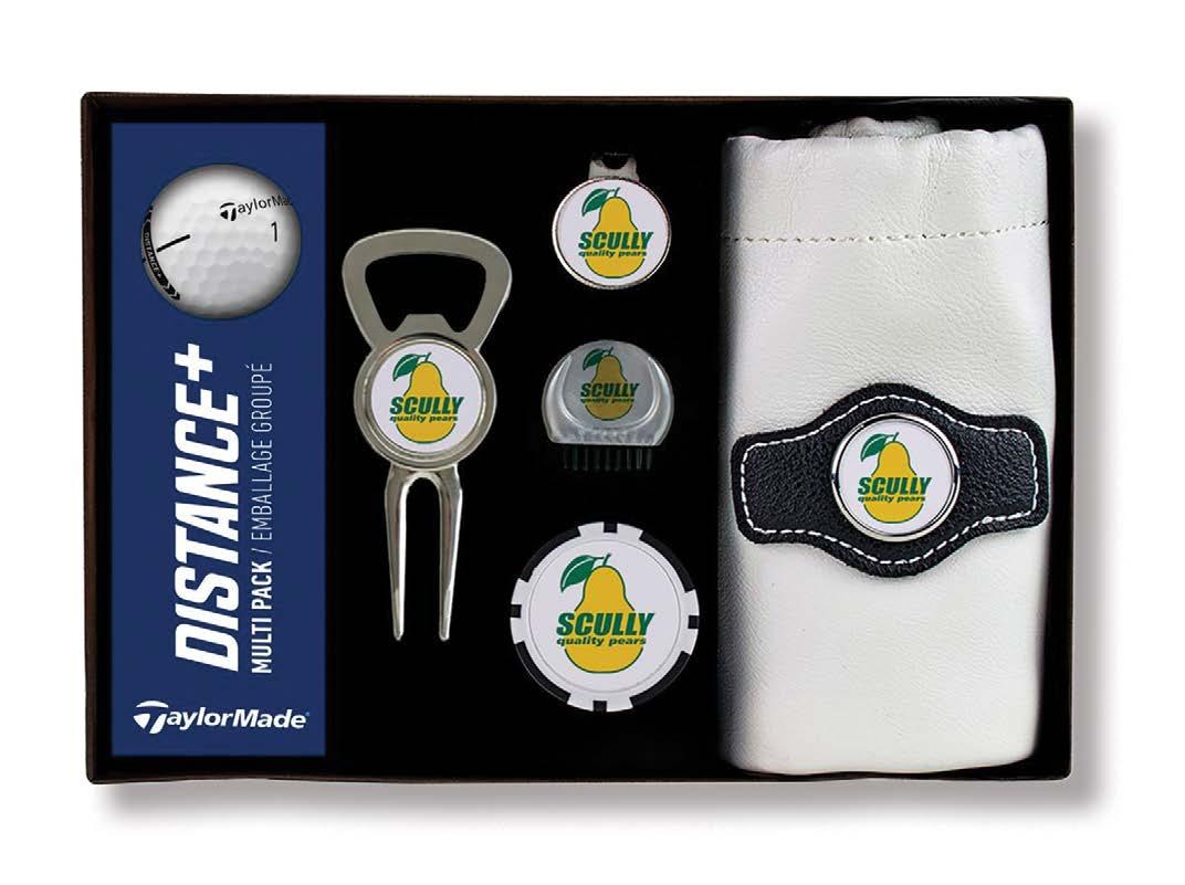 Packed with everything a golfer needs, this set includes TaylorMade Distance + balls, accessories, and pouch, all boxed together for tournaments, outings, or events.