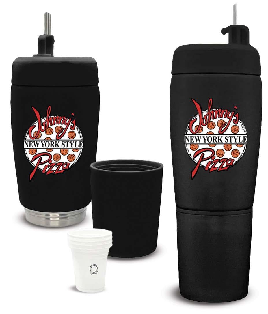 Vacuum insulated stainless steel flask with a pour spout and removable base. Features four hidden 2 oz. shot cups for easy sharing anywhere. 20 oz. 10"H