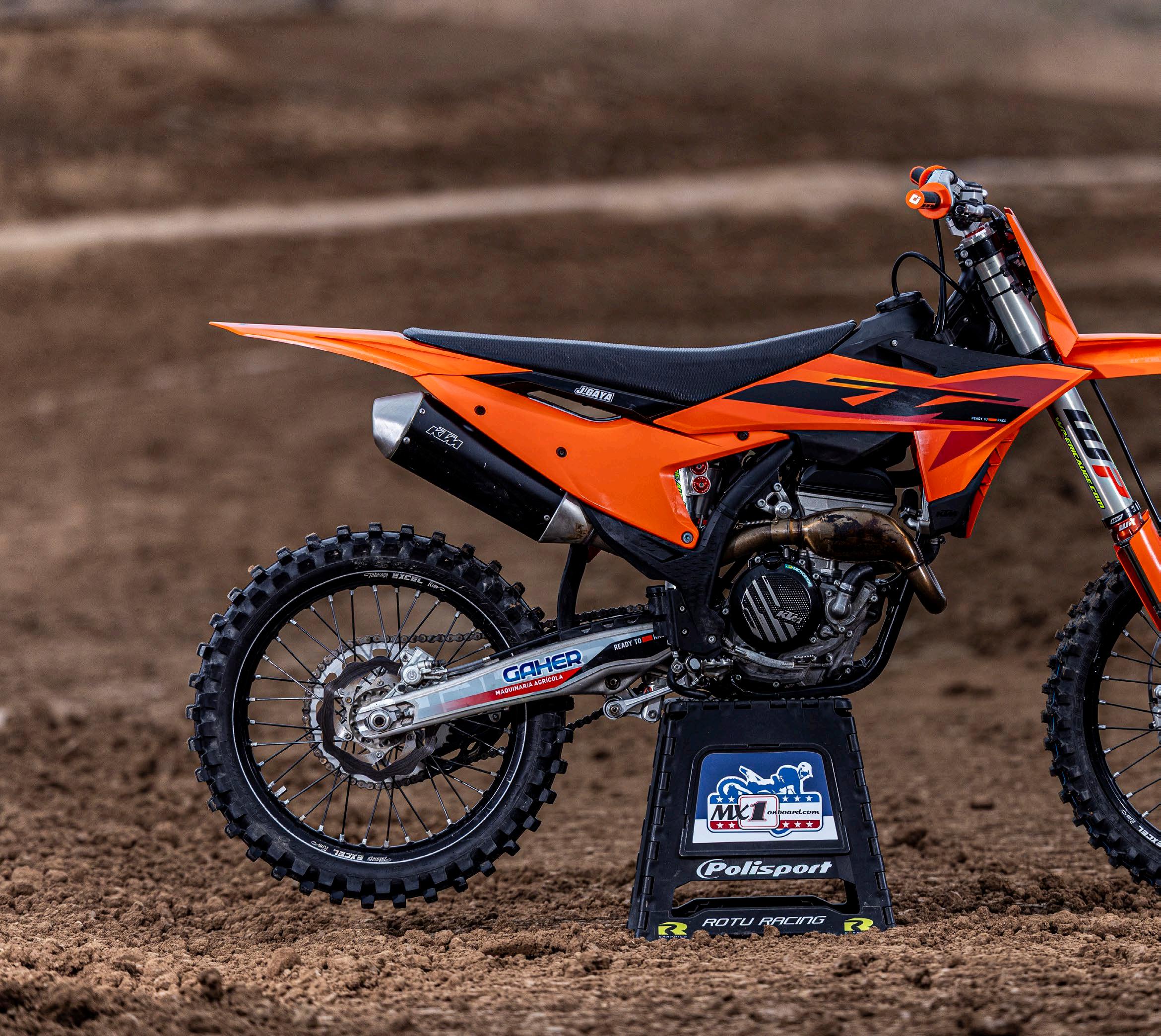 La SX-F quizá merece el galardón al motor más equilibrado en cuestiones de potencia, aunque lo de las austriacas es curioso, porque hay un porcentaje de pilotos a los que les agrada mucho el funcionamiento de su bastidor y de sus suspensiones WP, mientras que otros, en cambio, no acaban de adaptarse con facilidad. Desde nuestra dilatada experiencia como probadores, creemos que el chasis de las motos del grupo Pierer Mobility (KTM y GasGas) son verdaderamente competitivos, pero necesitan un mayor número de horas de adaptación y una muy buena puesta a punto del conjunto de las suspensiones para que realmente notemos su potencial. El chasis y el basculante mantienen la misma geometría que antes, pero se han eliminado materiales para crear una sensación más suave en la pista. Además, se han actualizado los ajustes de la suspensión para que funcionen con el nuevo chasis y el amortiguador tiene nuevos sellos de baja adherencia.