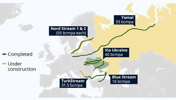 I paesi UE disporrebbero anche di una rete adeguata di impianti per aumentare l’afflusso. Sono una ventina gli impianti in attività sulle coste europee: di questi ben sei si trovano in Spagna e uno in Portogallo. Peccato che tra la penisola iberica e la Francia ci sia solo un pic colo gasdotto, insufficiente per le nuove ambizioni di autonomia energetica di Bruxelles. Non a caso, nell’ul tima settimana di febbraio è stato rilanciato il progetto Midcat, un condotto che partendo dal Portogallo arriva in Francia, convogliando il gas in arrivo ai rigassifica tori, ma anche una parte del gas algerino. L’iniziativa è stata del premier portoghese Antonio Costa che ne ha parlato al premier spagnolo Pedro Sanchez e al presi dente francese Emmanuel Macron al termine del Con siglio europeo del 25 febbraio. Poste le basi sul fronte infrastrutture, la UE deve poi trovare alternative al gas russo, senza scordare il sottostante tema economico: il GNL costa sul mercato molto di più del gas russo, per