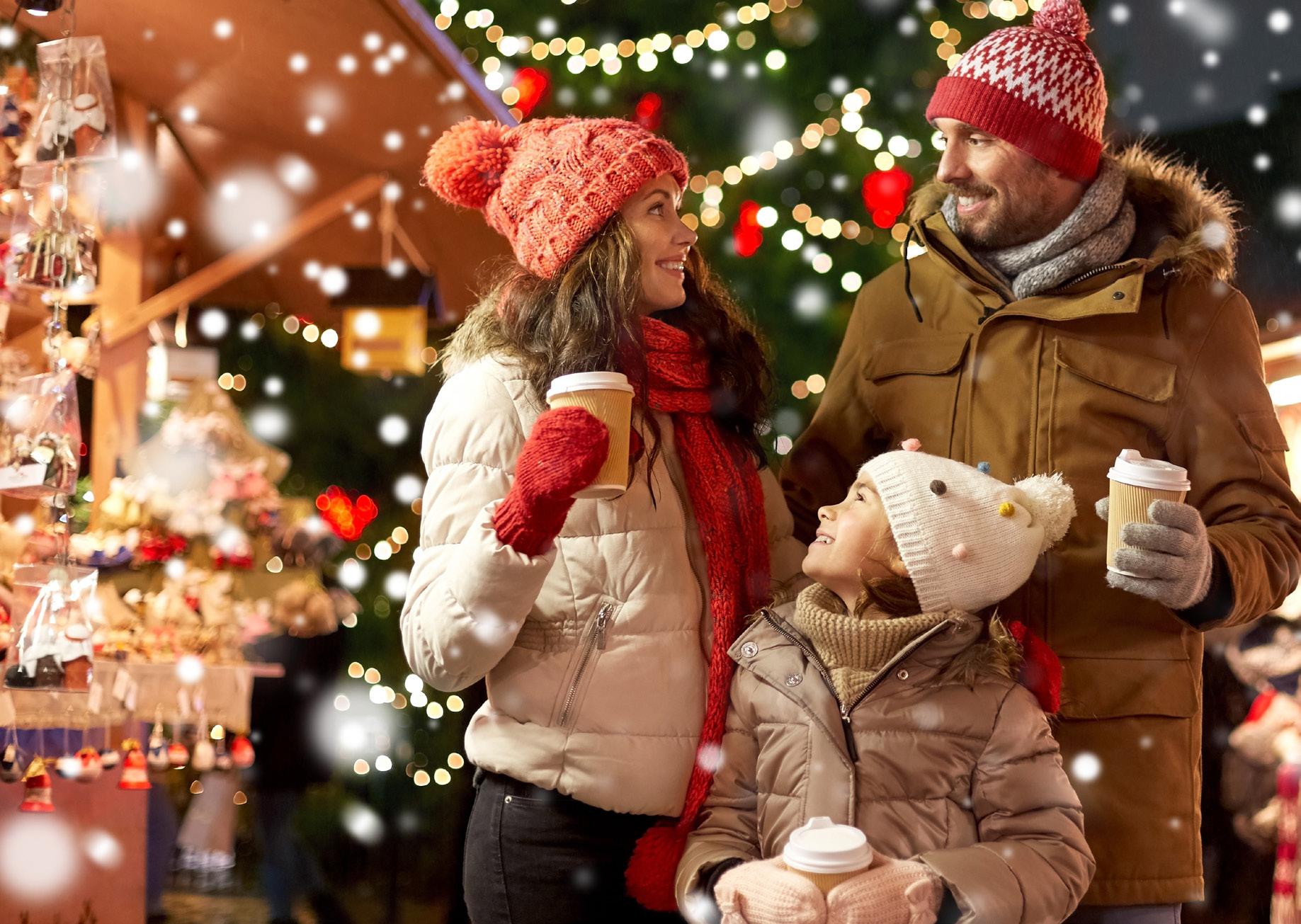 marquees lined with twinkling fairy lights and traditional timber log cabins decked out in festive displays.