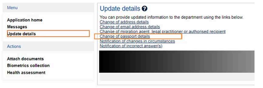 Gotothemenuontheleft-handside andclick“UpdateDetails”thenselect “ChangeofPassportDetails”. Followtheon-screeninstructions tocompletetheprocess.
