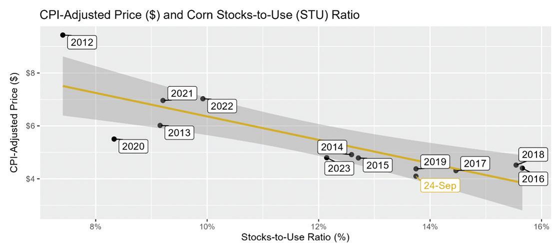 Gardner says consumer price index-adjusted corn prices are the lowest since 2011 and soybeans are nearing 2019 lows. “Without a signi cant change in the yield estimate due to drought or overestimation, it is hard to envision a sharp price rise for the 2024/25 marketing year.” CS