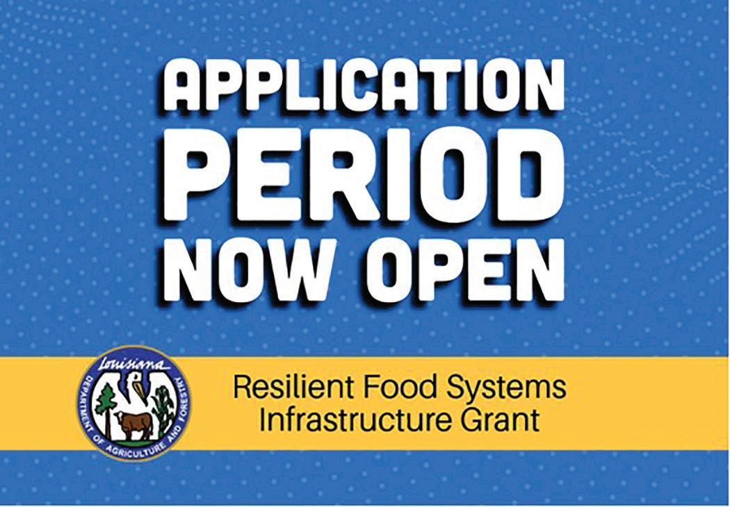 Applications are due no later than 4:30 p.m. CT on April 15, 2024. For more information on the applications, please download and carefully read the Request for Applications at https://www. ldaf.la.gov/business/grants-funding/resilient-food-systems-infrastructure.