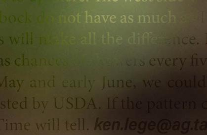 ere is much interest in how many acres of cotton will be planted in the high plains this year. Acres have already begun to be planted in the northern plains (north of Amarillo); that area saw many prevented acres in 2023, and we expect to have the typical acreage planted in 2024. In the southern high plains, it is all about moisture, and there are few crop alternatives beyond cotton. As mentioned previously, the east side of the region has very good soil moisture conditions, and cotton acreage should be stable to up there. e west side and much of the sandier areas south of Lubbock do not have as much soil moisture; however, timely planting rains will make all the di erence. If the current weather pattern, which has chances of showers every ve to seven days, continues throughout May and early June, we could see acreage increase above that forecasted by USDA. If the pattern changes, it could be dramatically lower. Time will tell. ken.lege@ag.tamu.edu
