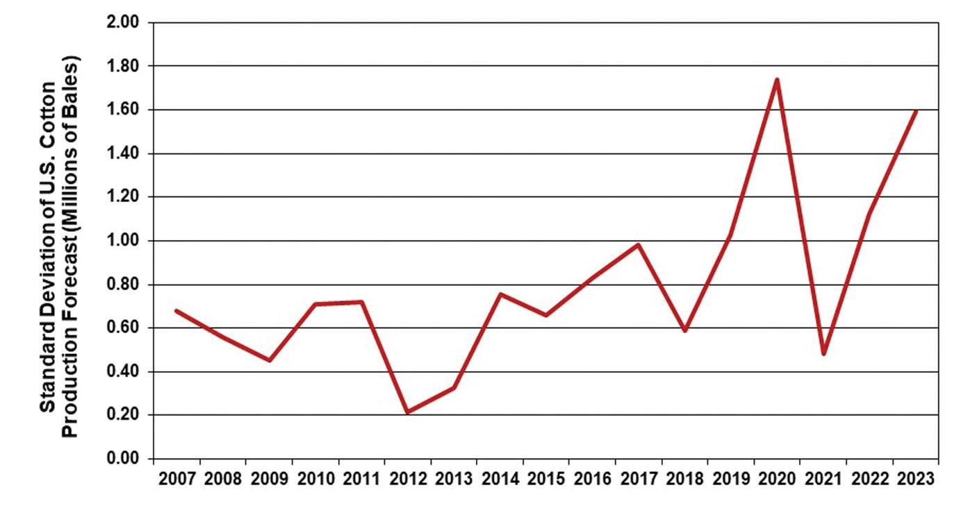 Figure 1 provides a description of the variability of USDA NASS monthly forecasts of U.S. cotton by crop year. For example, the year 2012 in Figure 1 graphs the standard deviation (roughly 200,000 bales) around the average of forecasted cotton production from the May 2012 initial monthly forecast through the following April (2013) forecast of 2012 cotton production.