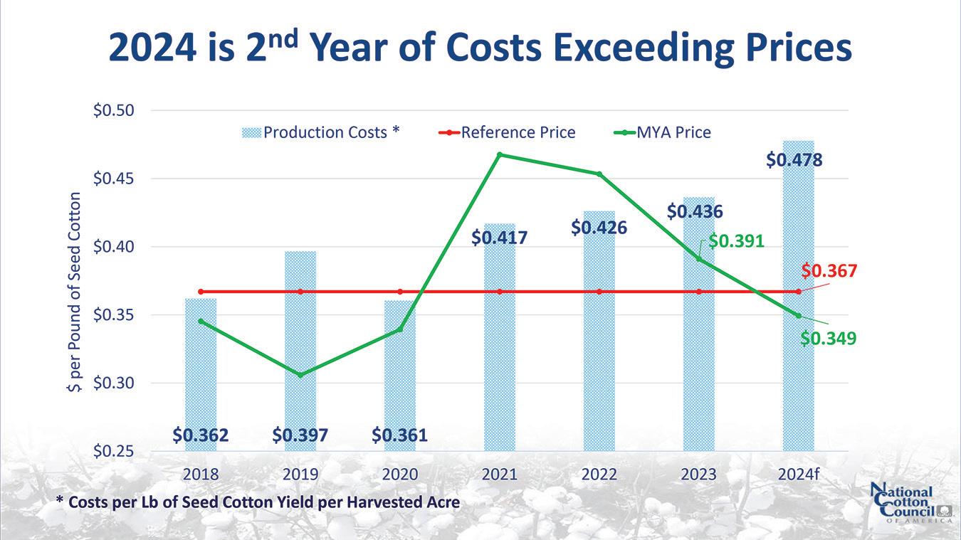 cost per pound of seed cotton for 2023 is $0.436, calculated from total costs of $883 and a yield of 2,023 pounds per acre. For 2024, with a projected lint yield of 828 pounds and cottonseed yield of 1,043 pounds, the cost per pound is expected to rise to $0.482, which is over 11 cents higher than in 2018. Current production costs are well above both the statutory reference price of $0.367 and the seed cotton market year average (MYA) price.