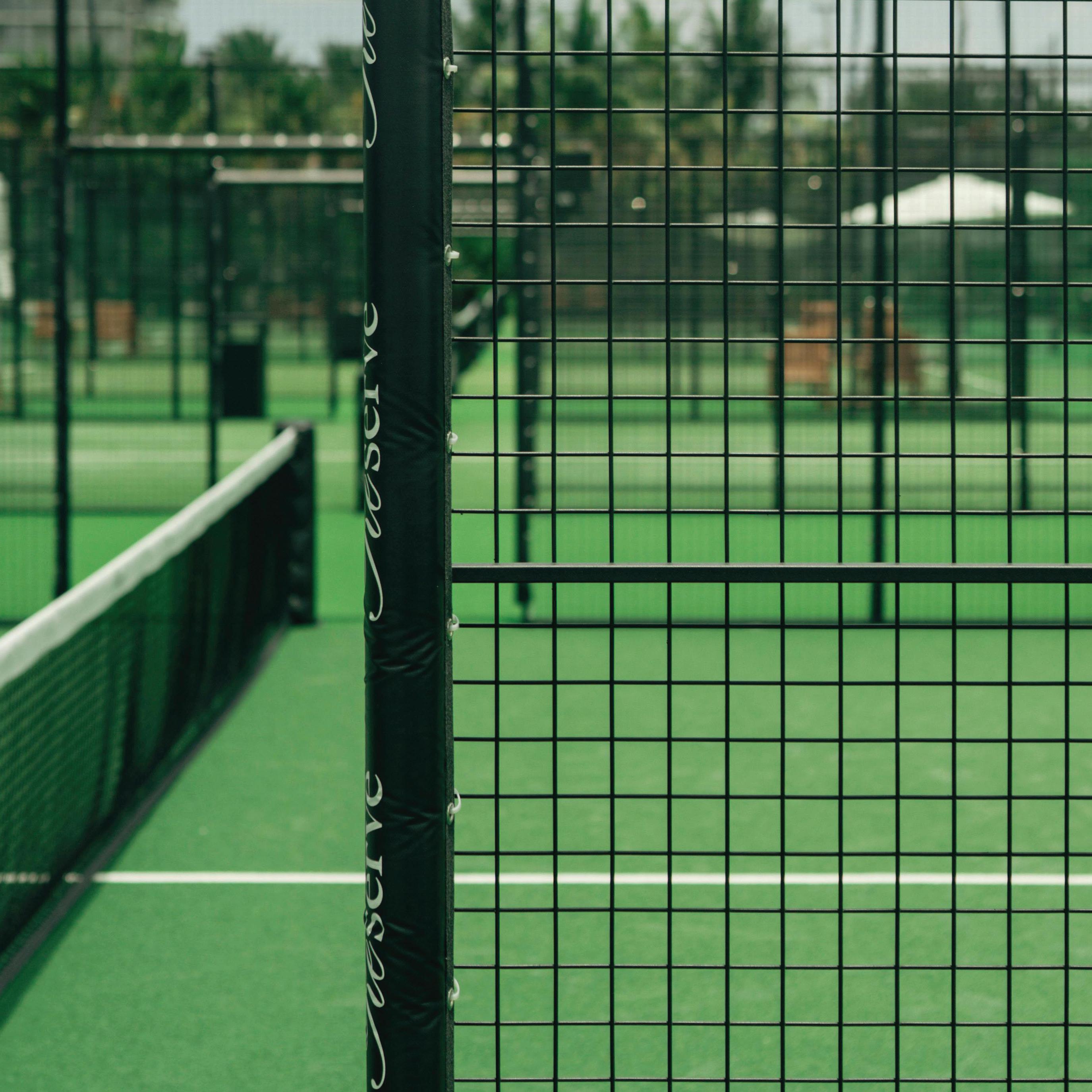 World-class padel on a private island with pristine courts, professional coaching, and a luxurious members-only atmosphere surrounded by lush private hedging.