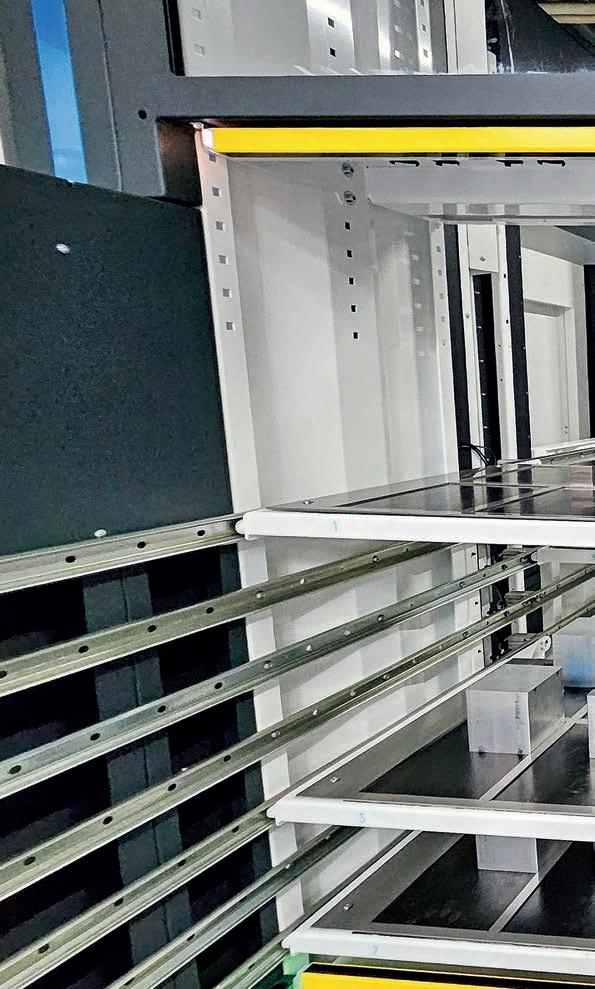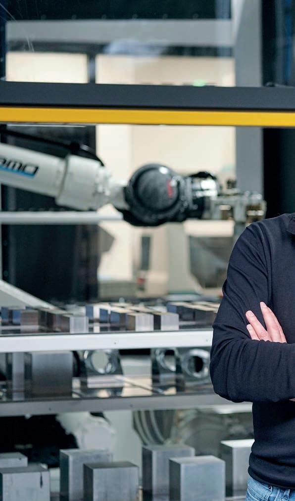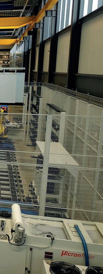 dubbele van de eerste PAMA (180). Ook de spanentransporteurs zijn breder uitgevoerd om de grote hoeveelheden aluminiumspanen beter af te voeren. ‘De eerste machine heeft een kettingwisselaar, deze heeft een robotsysteem’, zegt Frans de Rooy. ‘Dat werkt sneller en betrouwbaarder. We houden de machines zo universeel mogelijk, zodat we zowel aluminium als staal kunnen verspanen.’