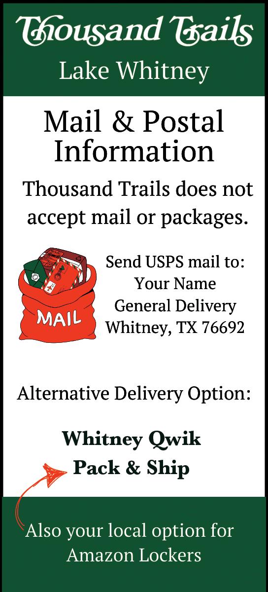 This Campground is located in Hill County on the east side of Lake Whitney. The county to the west of Lake Whitney is Bosque. This property does not have designated storm shelters. Use of any building or common area as shelter is done so at your risk. Refer to the Department of Homeland Security or Ready.gov for information.