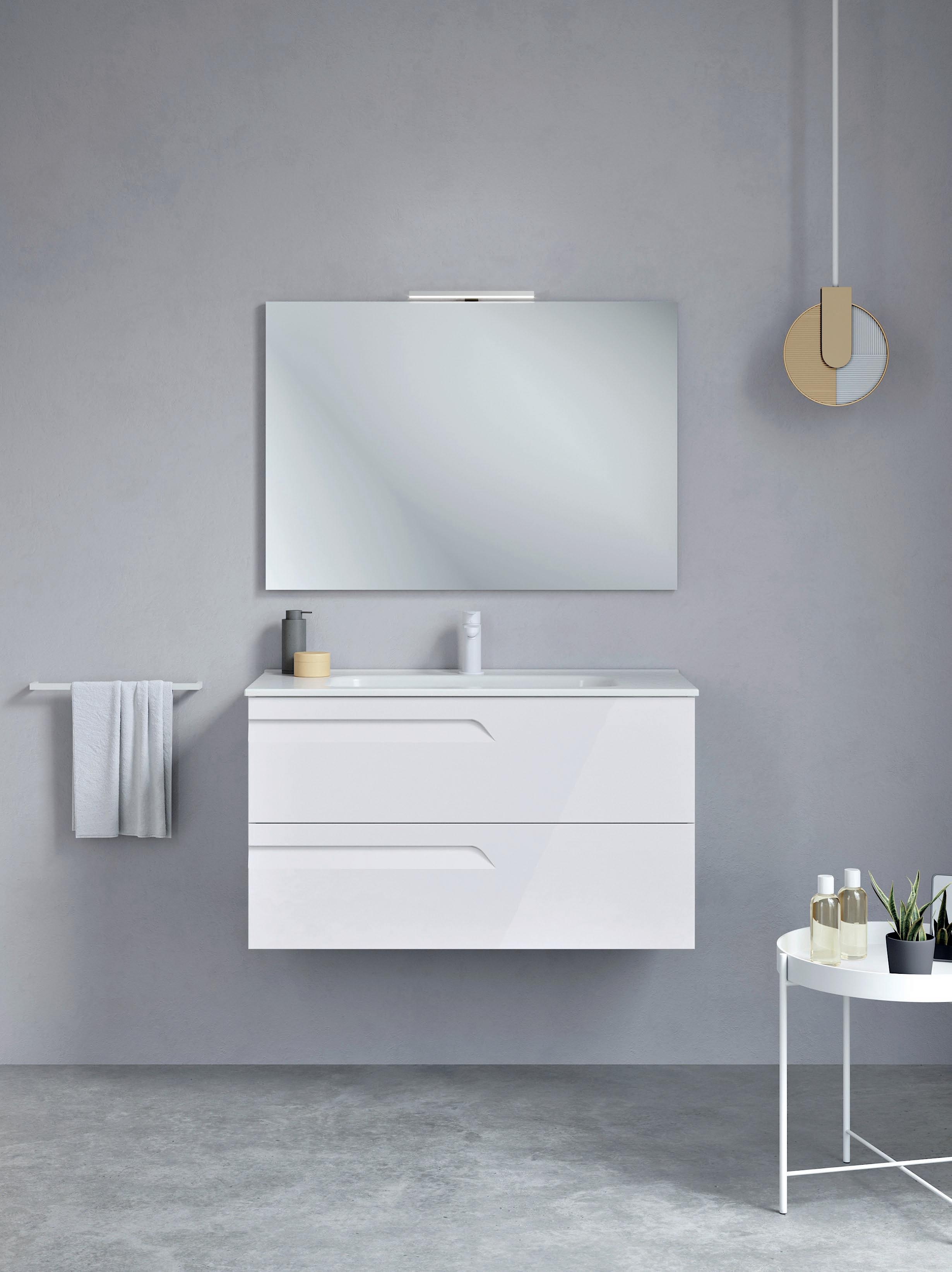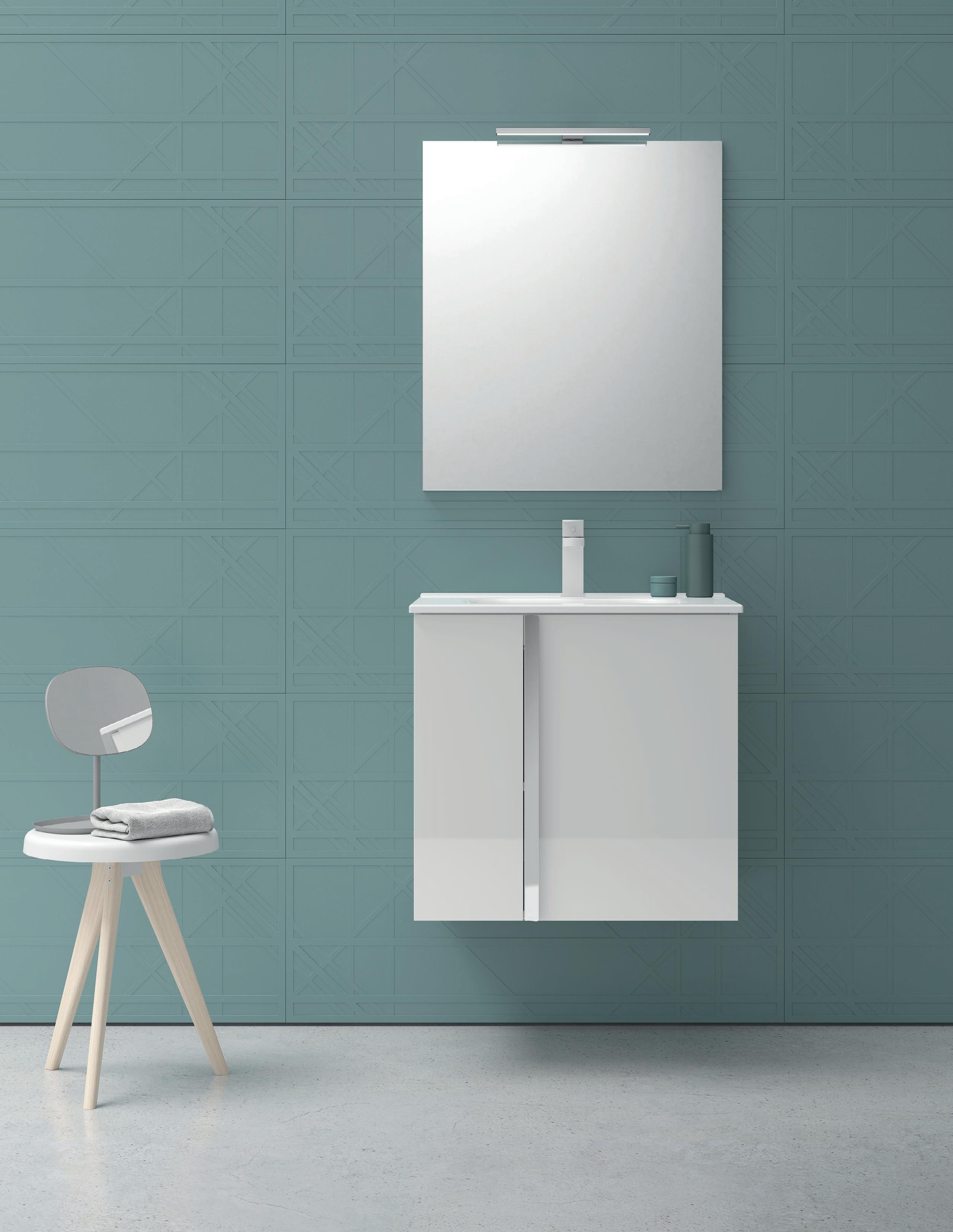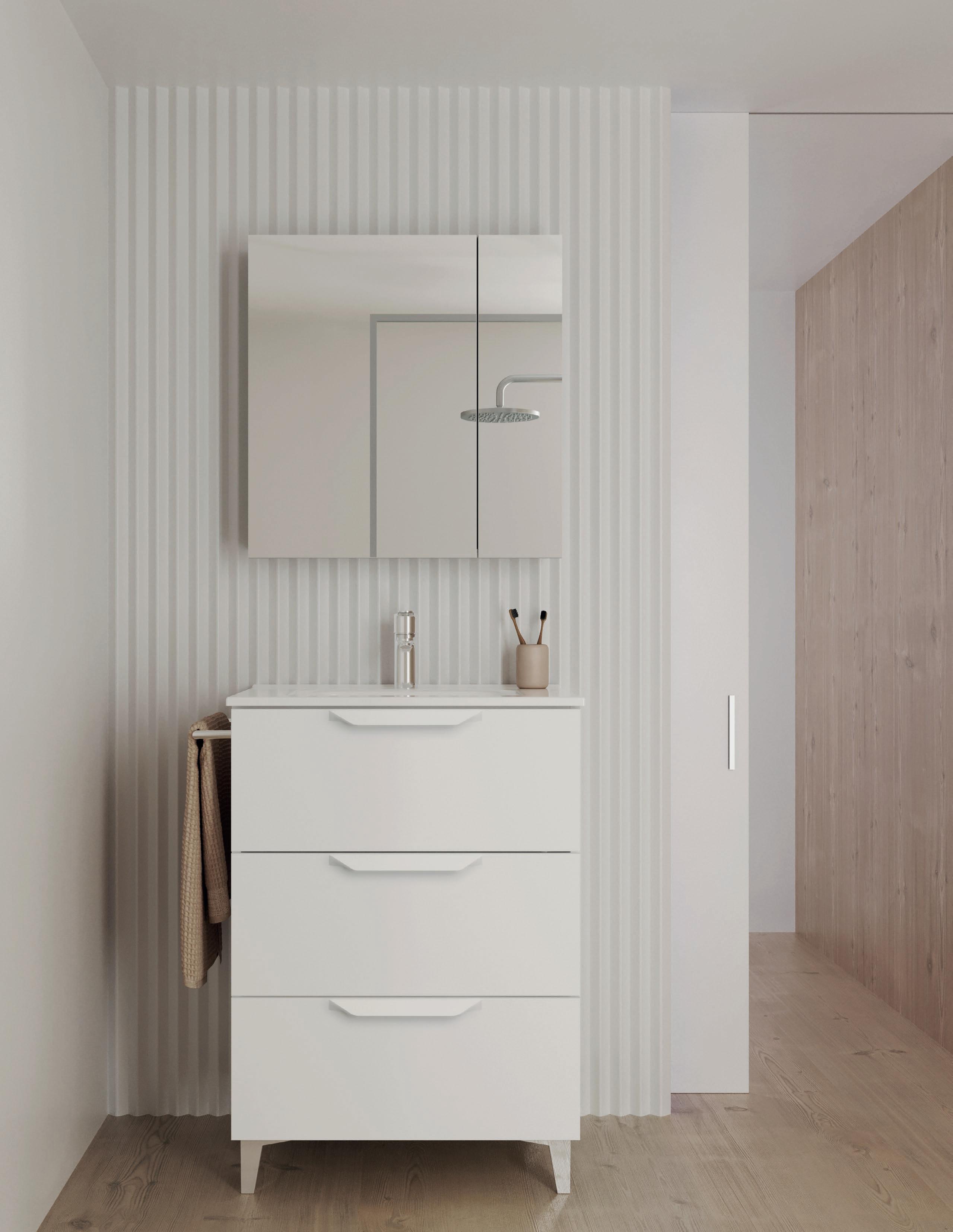 Interior distribution: 2 glass shelves. Mirror cabinet with damped closure hinges. Profile is available in one finish, lacquered white melamine.