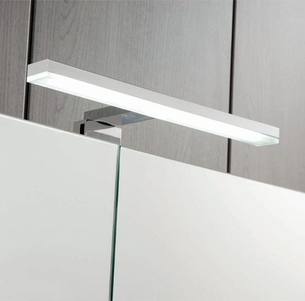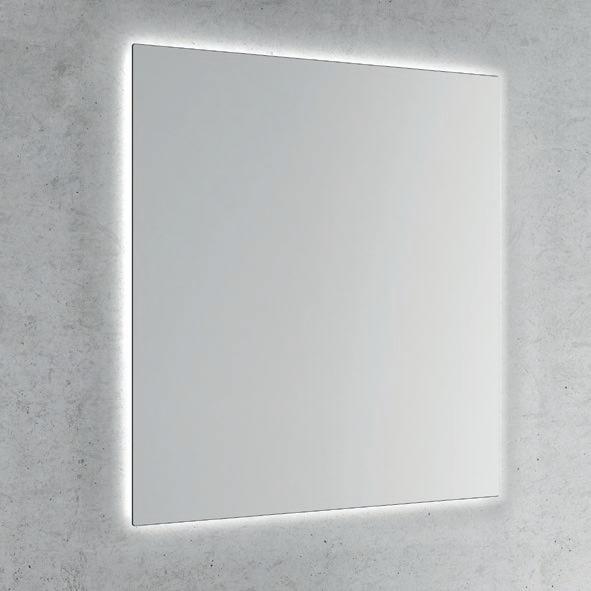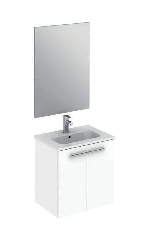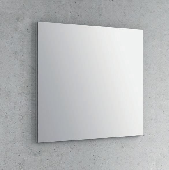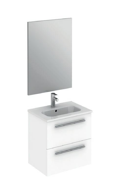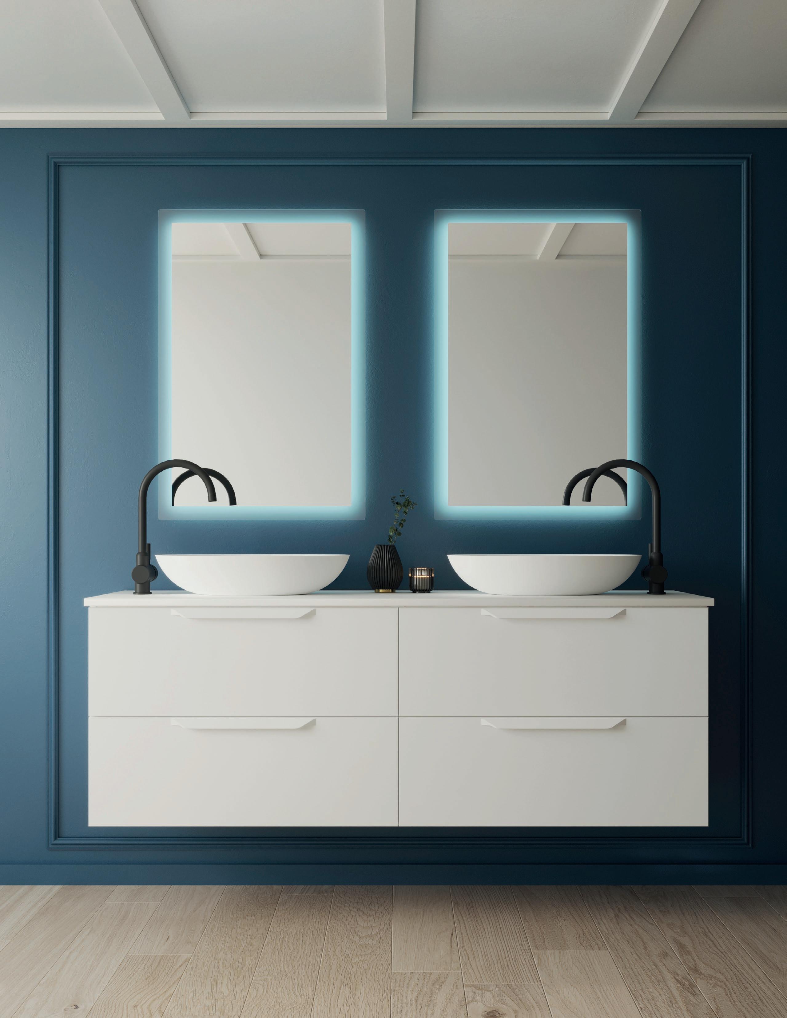 Interior distribution: 2 glass shelves. Mirror cabinet with damped closure hinges. Profile is available in one finish, lacquered white melamine.