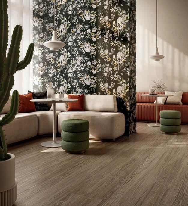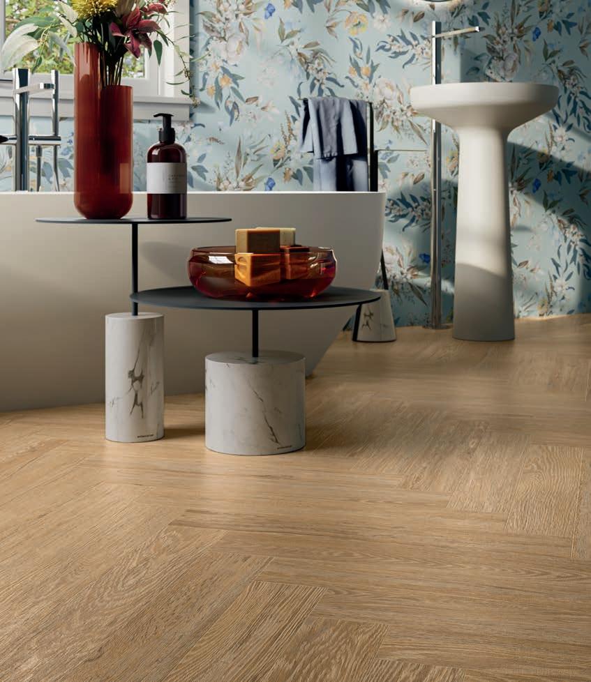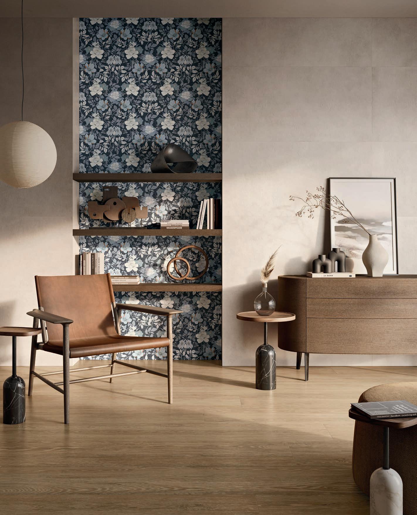 La continuità del gres effetto legno a pavimento, esalta l’abbinamento di diversi rivestimenti a parete, lasciando ampio spazio alle carte da parati floreali, che rendono l’ambiente un “dipinto” da abitare.