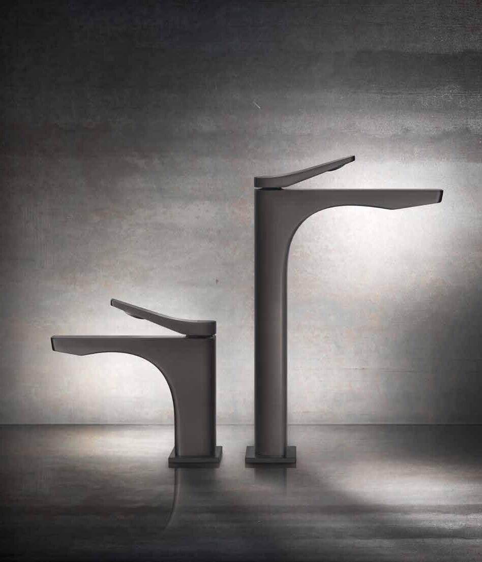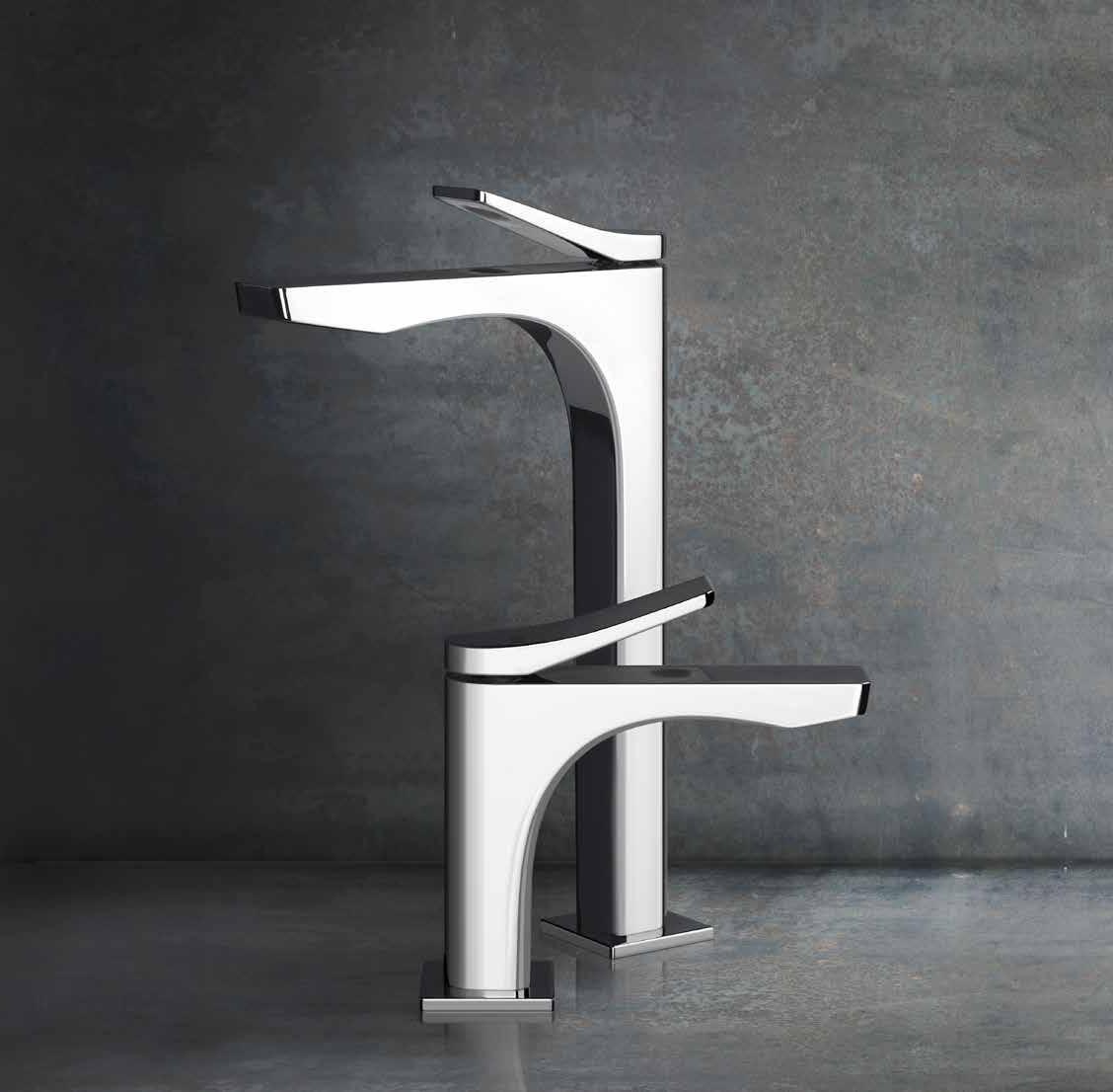 Il concetto del cerchio inscritto nel quadrato viene ripreso sia in pianta che di profilo su tutte le linee del prodotto: in pianta il corpo stondato sul retro del rubinetto è inscritto nel quadrato della sua base; lateralmente lo steso gioco viene riproposto sul taglio circolare del profilo inquadrato nella linearità squadrata del corpo; infine lo stesso gioco viene riproposto in maniera elegantemente discreta dal dettaglio tondo sbalzato sotto l’estremità squadrata della maniglia.