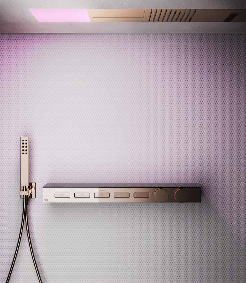 Multifunction shower systems, as those that can be controlled with Hi-Fi mixers, redefine the users’ interaction with water and the pleasure of an experience that goes beyond mere hygiene needs. The bathroom becomes a space to invent and customize, the room which combines immediate functionality to the possibility of gratifying the users’ emotional sphere and well-being.