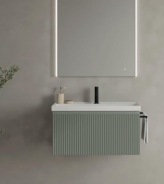 A fürdőszoba dizájnja tökéletes példája a stílusos modernitásnak. A függesztett mosdótál, a nyitott zuhany, a dizájnos falburkolatok, a modern függőlámpák, valamint a rejtett világítású tükör harmonikus kompozíciót alkotnak.