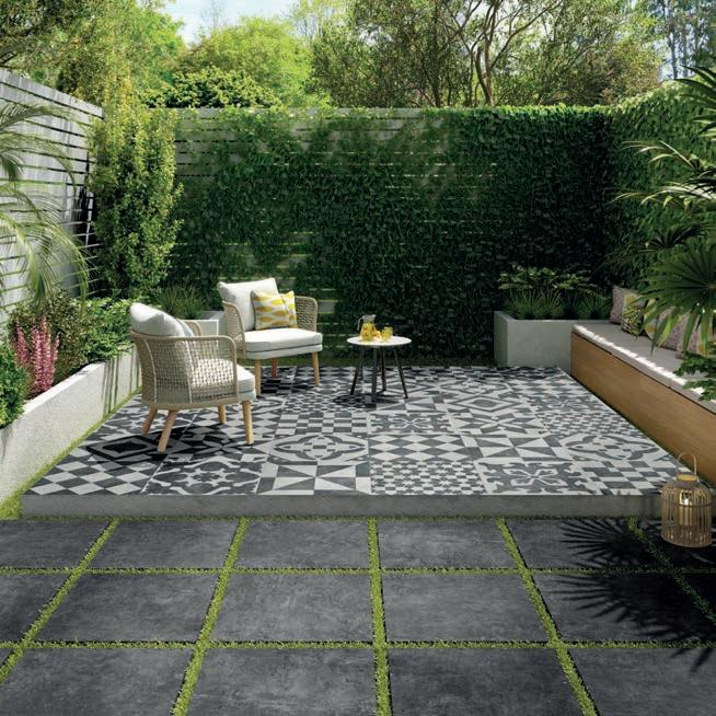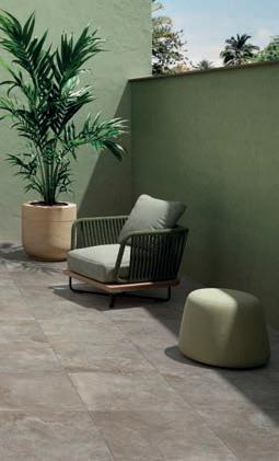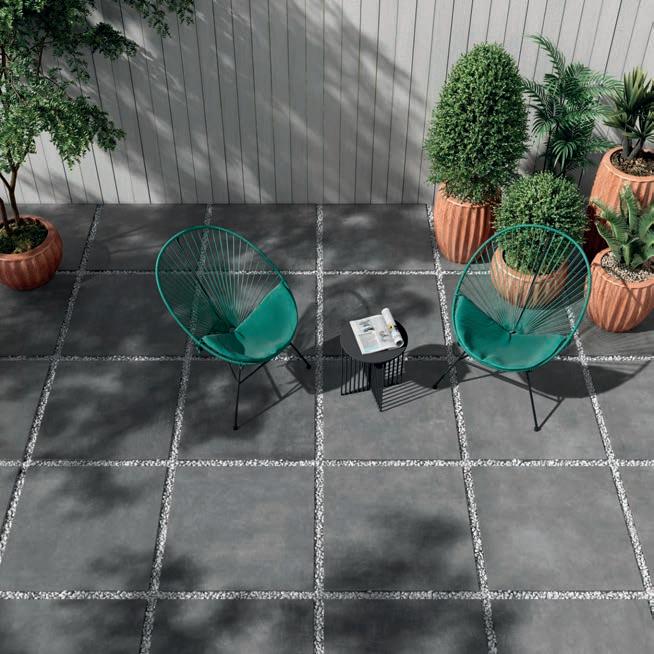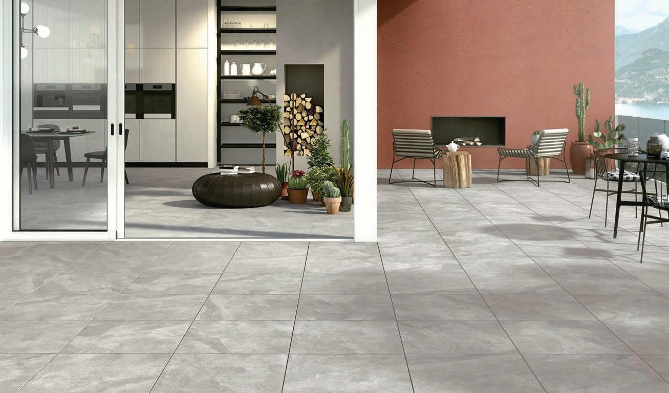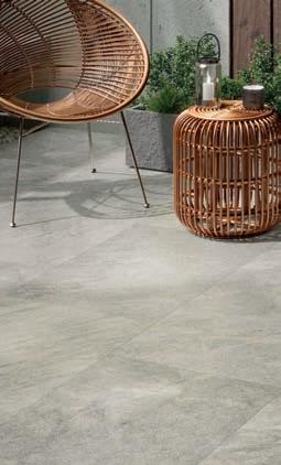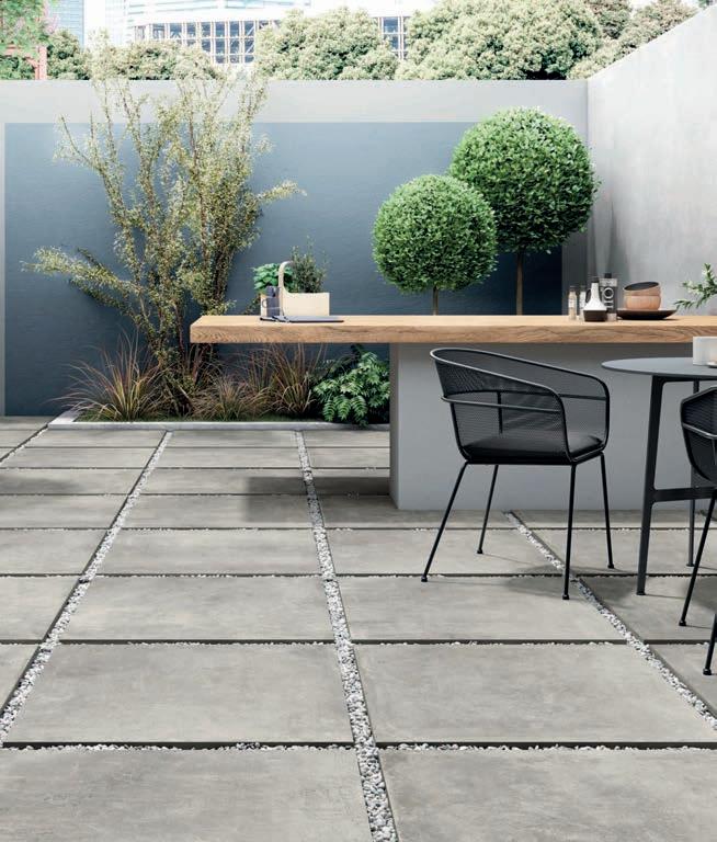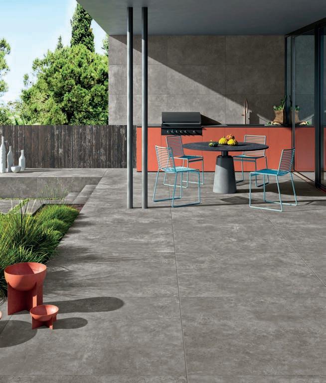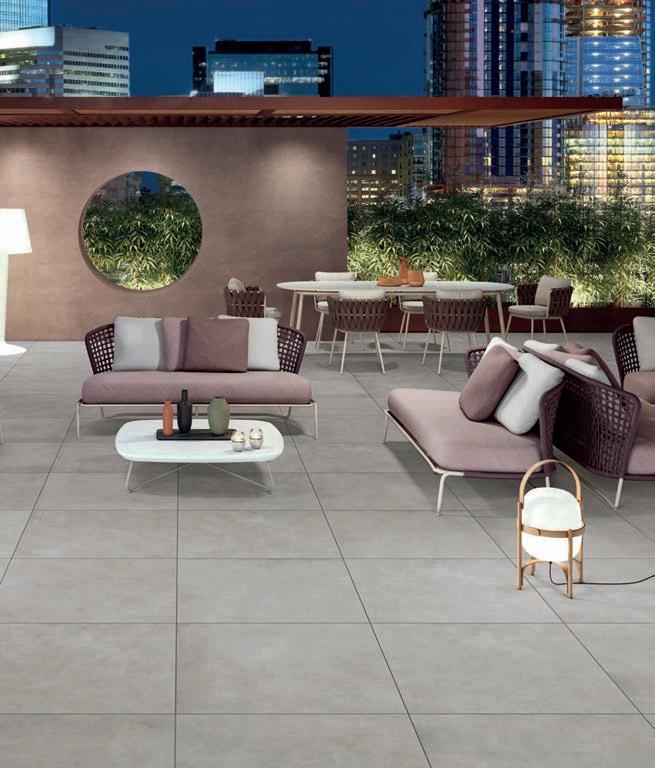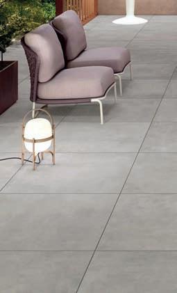 Sintesi ofrece una amplia gama de pavimentos con un acabado específico para espacios exteriores, tanto en espesor estándar coordinado con pavimentos de interior, como en losas con espesor extra de 20 mm que ofrecen múltiples posibilidades de colocación, incluso sobre césped, arena o grava.