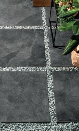 Sintesi offre un’ampia gamma di pavimenti con finitura specifica per spazi esterni, sia nello spessore standard coordinato ai pavimenti per interni, sia in lastre con extra-spessore di 20mm che offrono molteplici opportunità di posa, anche in appoggio su erba, sabbia o ghiaia.