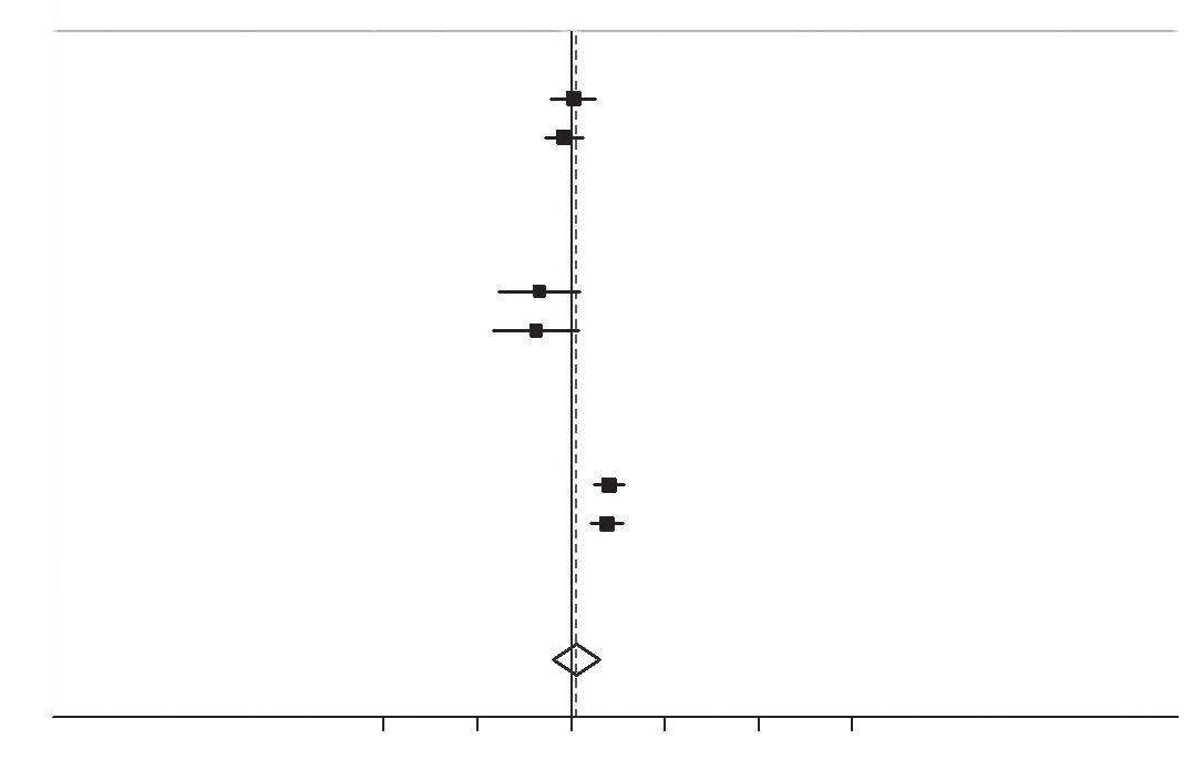 Notes: The black vertical line corresponds to no effect of noise exposure. The black dots correspond to the estimated slope coefficients per 10 dB for each sex in each study, with 95% CIs. The diamond designates summary estimates and 95% CIs based on random effects models. The dashed red line corresponds to these summary estimates. Heterogeneity between studies: p = 0.000; heterogeneity between genders: p = 0.360; overall (I-squared = 84.4%, p = 0.000). Weights are from random effect analysis.