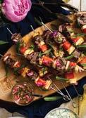 Thread the steak, watermelon, halloumi, and red onion onto a series of stainless steel skewers or bamboo skewers that have been soaked overnight.