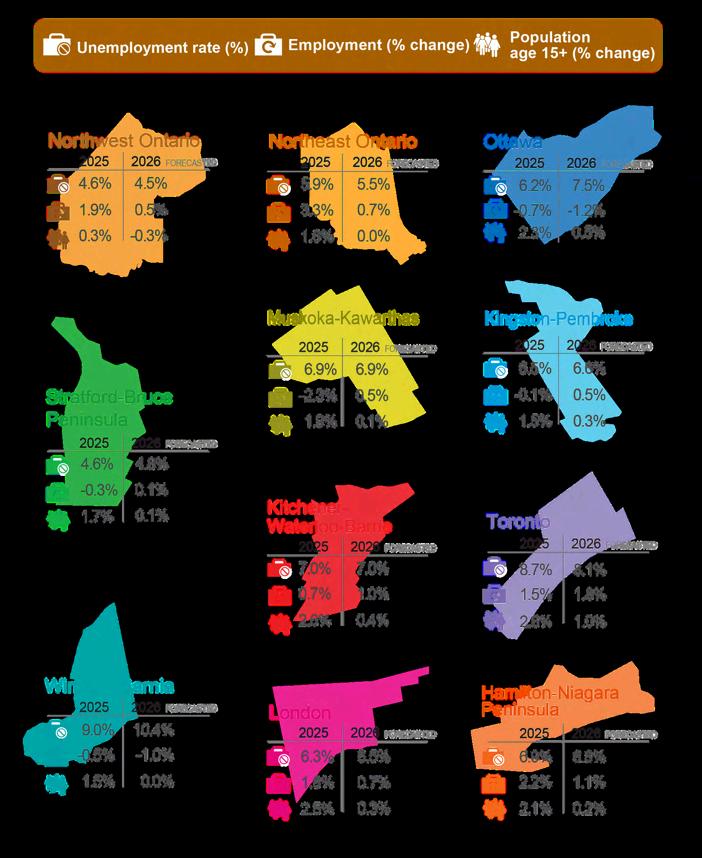 Figure 26 illustrates the 2025 and 2026 forecasted values of three key economic indicators for Ontario’s 11 economic regions as defined by Statistics Canada: the jobless rate, change in employment, and change in population (ages 15 and older).