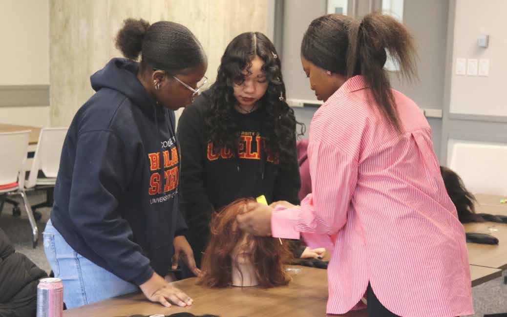 Image from the 2025 hair care event "Tresses and Wellness" where students learned some hair care tips and various braiding techniques. Photo provided by the Black History Month Planning Committee