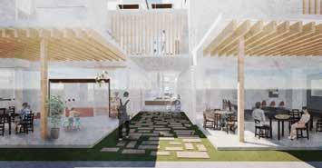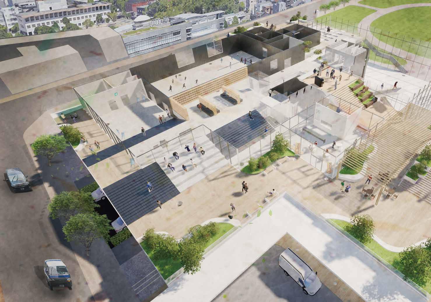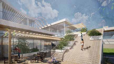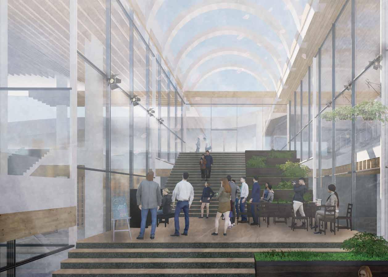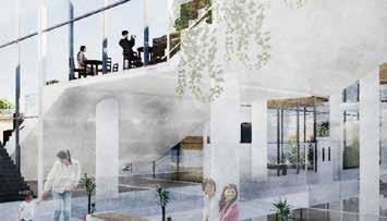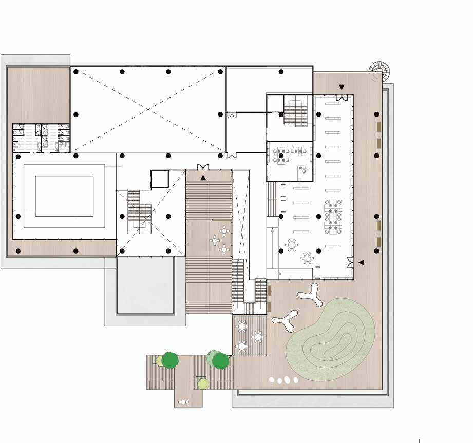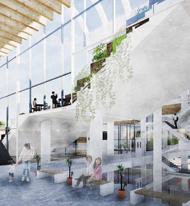 ヴォイド空間に図書館・カフェ・多目的ホール・ギャラリーといった機能を配置する 利用者はトラジェクトリーによる自然な移動と様々な機能空間との出会いが生まれ、 偶発的で相補的な営みが建築全体に広がっていく、こうして変形したトラジェクトリーを回遊 しながら敷地周辺の観光地・公園を展望しそしてこの建築は街に開かれる