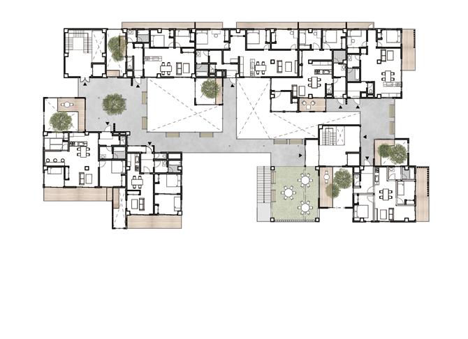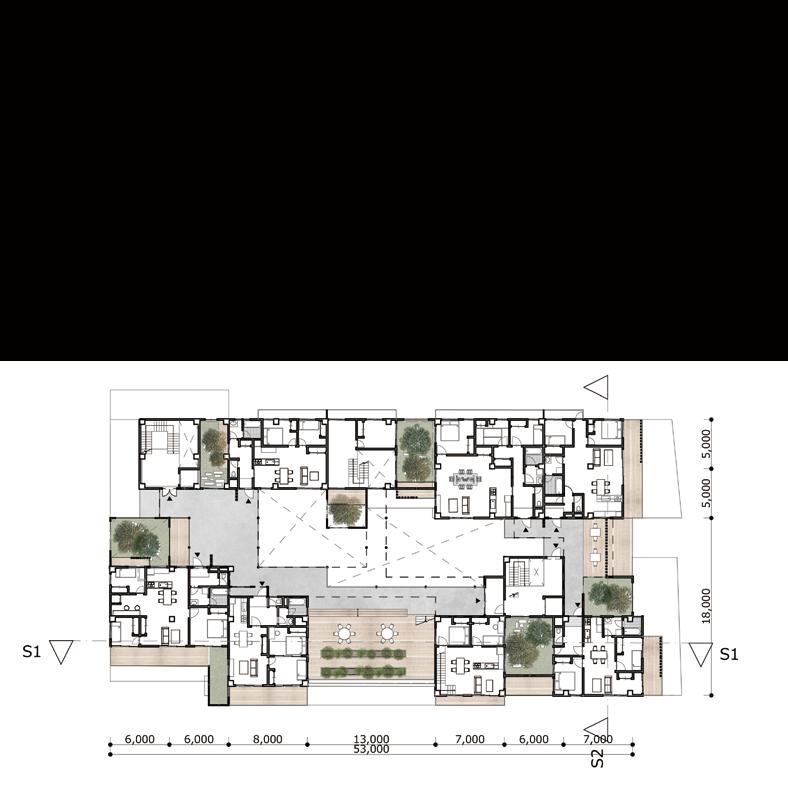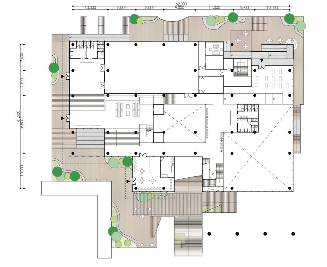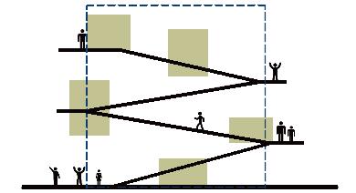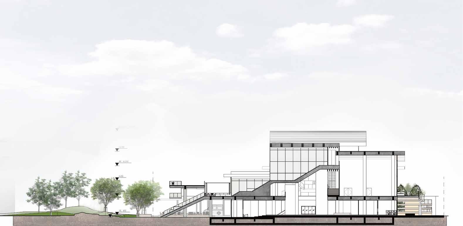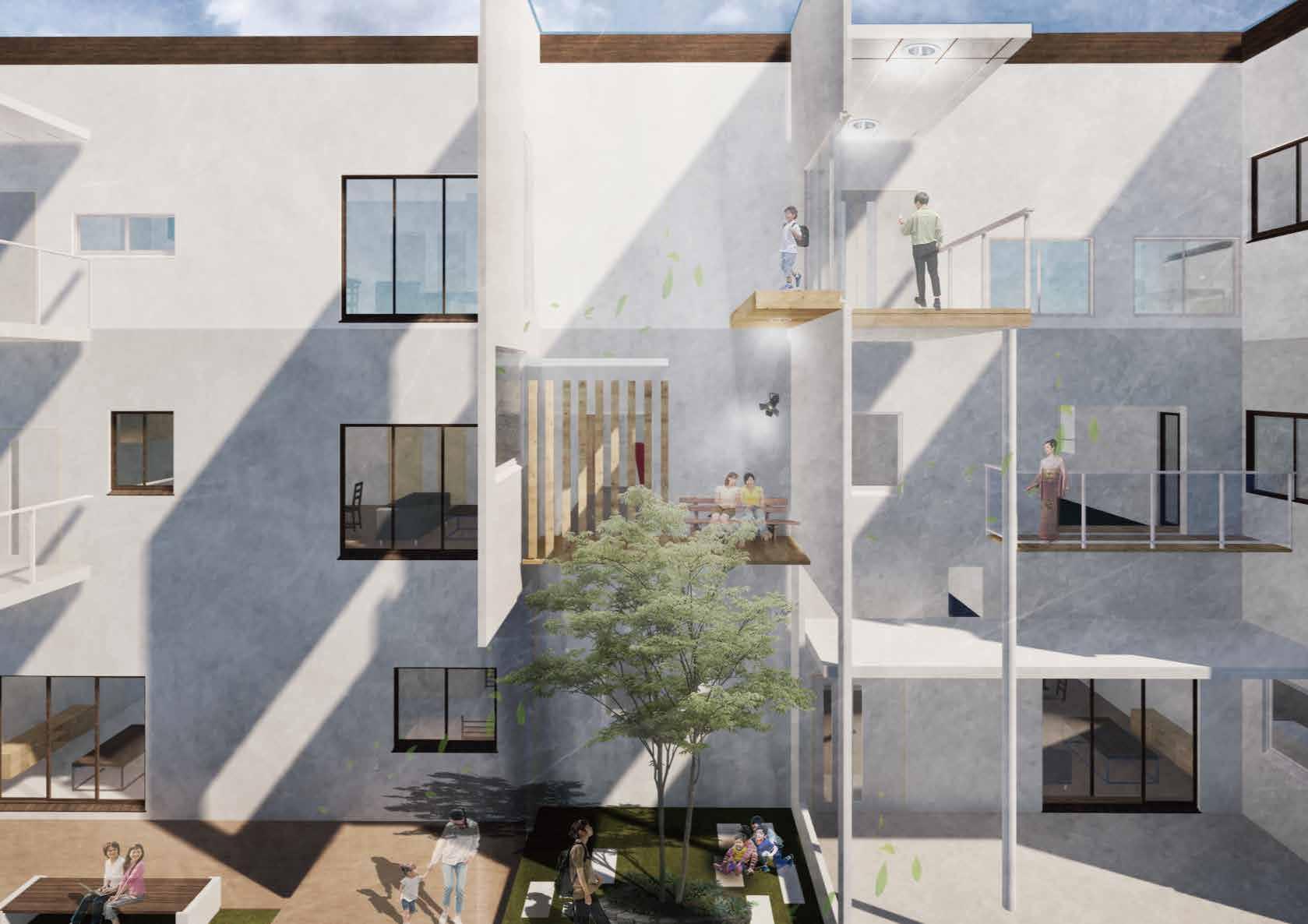 ひとつづきの動線トラジェクトリー(街路空間)を作り、緩い階段・スロープ・植栽で 一階から屋上までを緩やかに連続させ変形しつなげる
