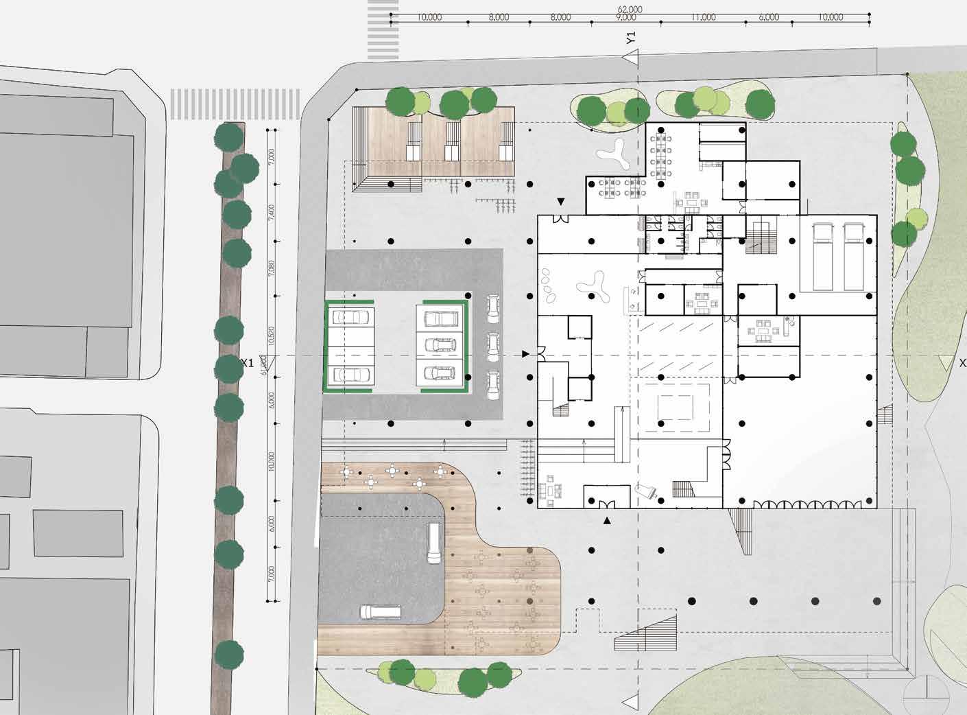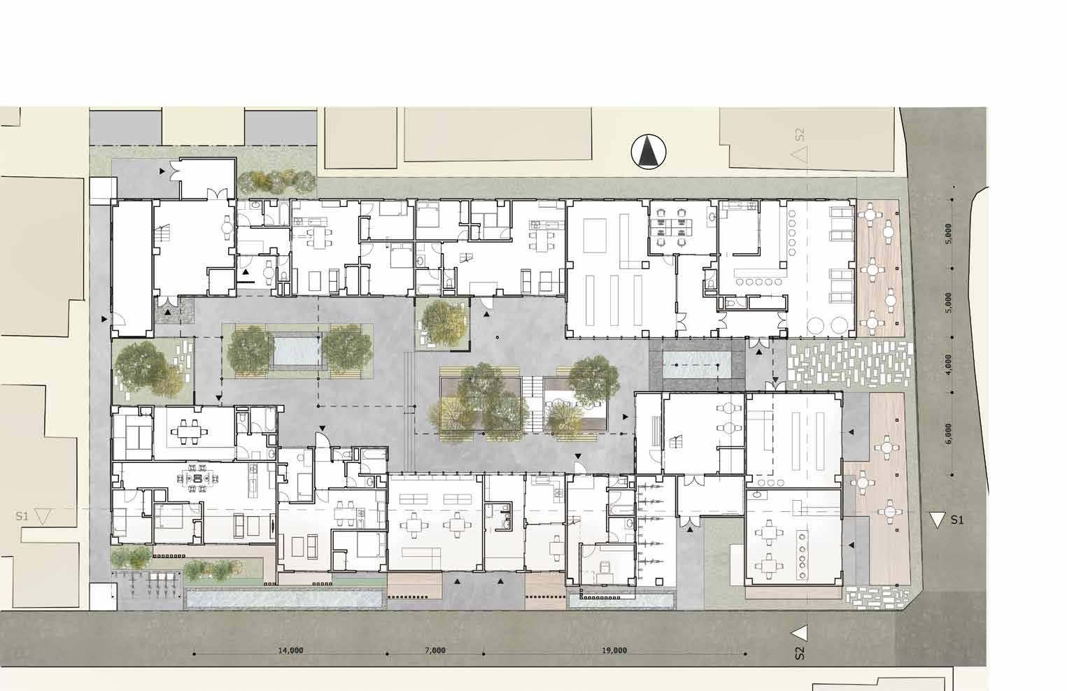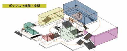 多種多様な機能をトラジェクトリー(室内外街路空間)の変形を駆使しまちに開かれた建築を目指す。