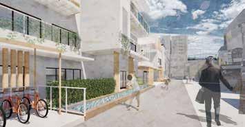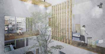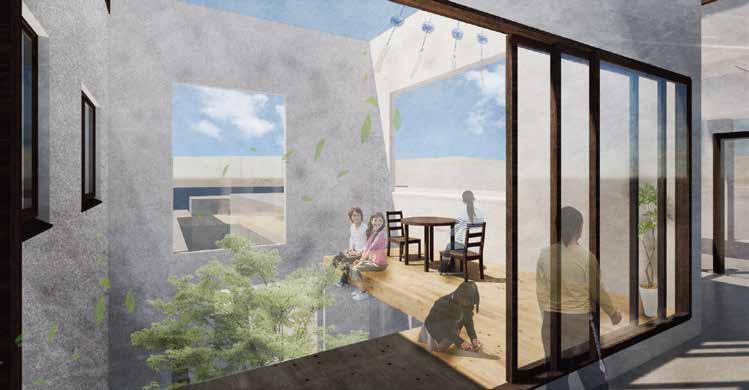 風情のある店が立ち並ぶ鞍月用水を 東側に置く本敷地で、用水沿いの賑わい・ コロナによって失われた住民間の営み や賑わいを再編する空間を計画した 関わりを切り捨てるのではなく、坪庭を介し