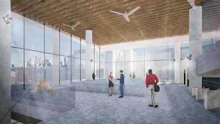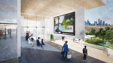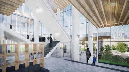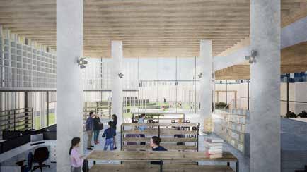 貸出なしの図書館となっている、天井高を高くし 開放的な空間に計画、屋上公園での様子も ルーバー越しに感じることができる