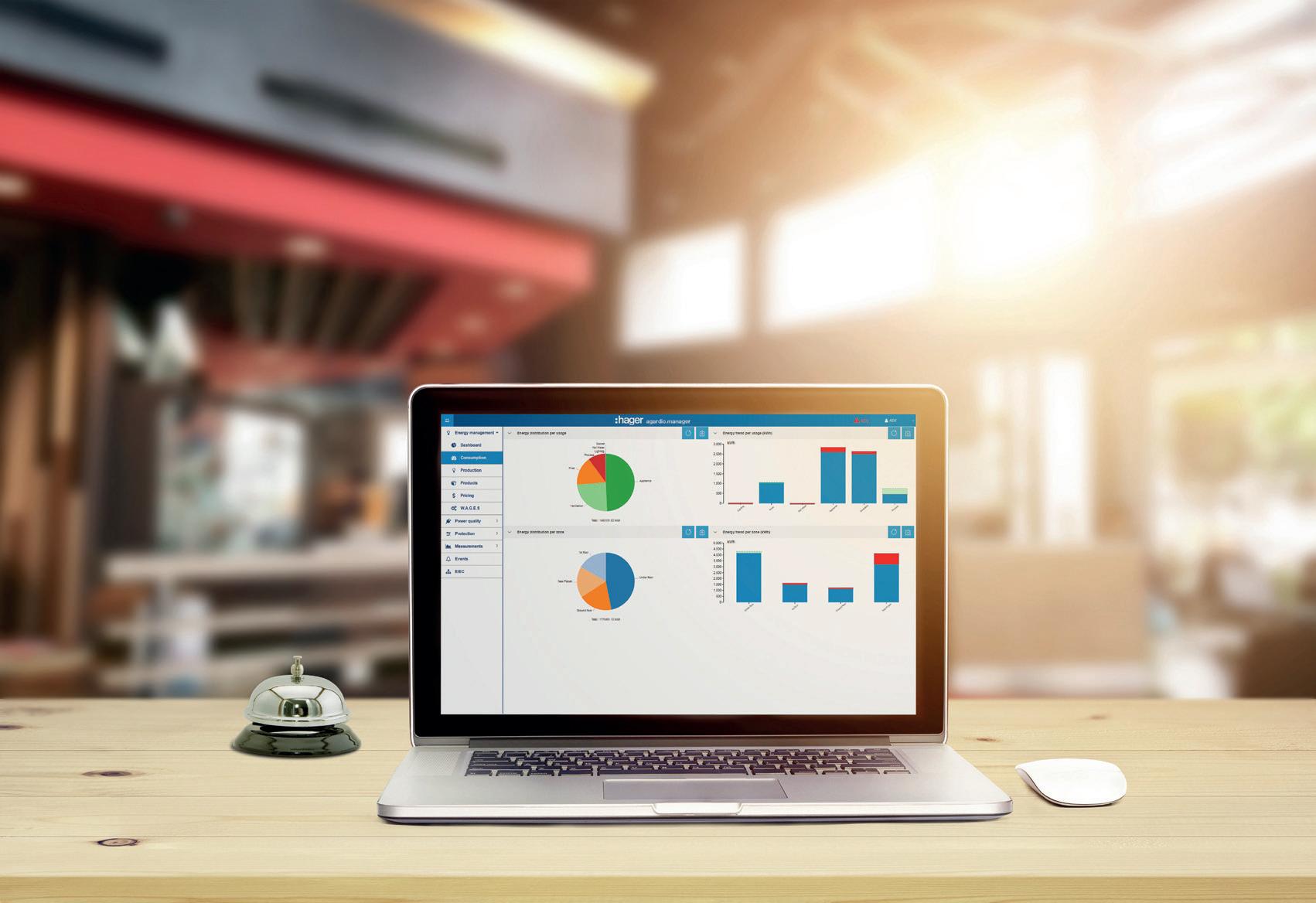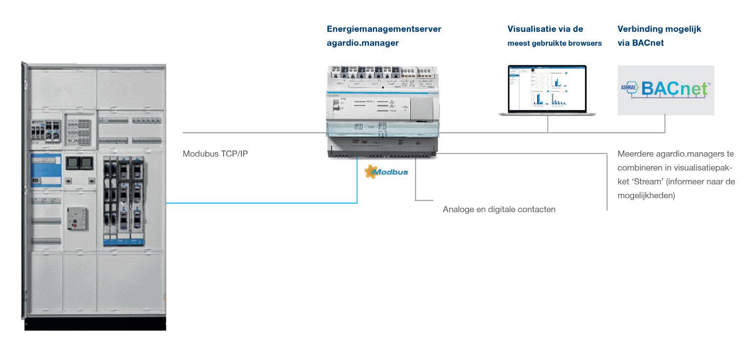 Binnen een intelligent energiedis tributiesysteem werkt de agardio. manager perfect samen met de Hager DIN-rail energiemeters, pa neelmeters, h3+ Energy MCCB’s en andere dataleverende apparaten.