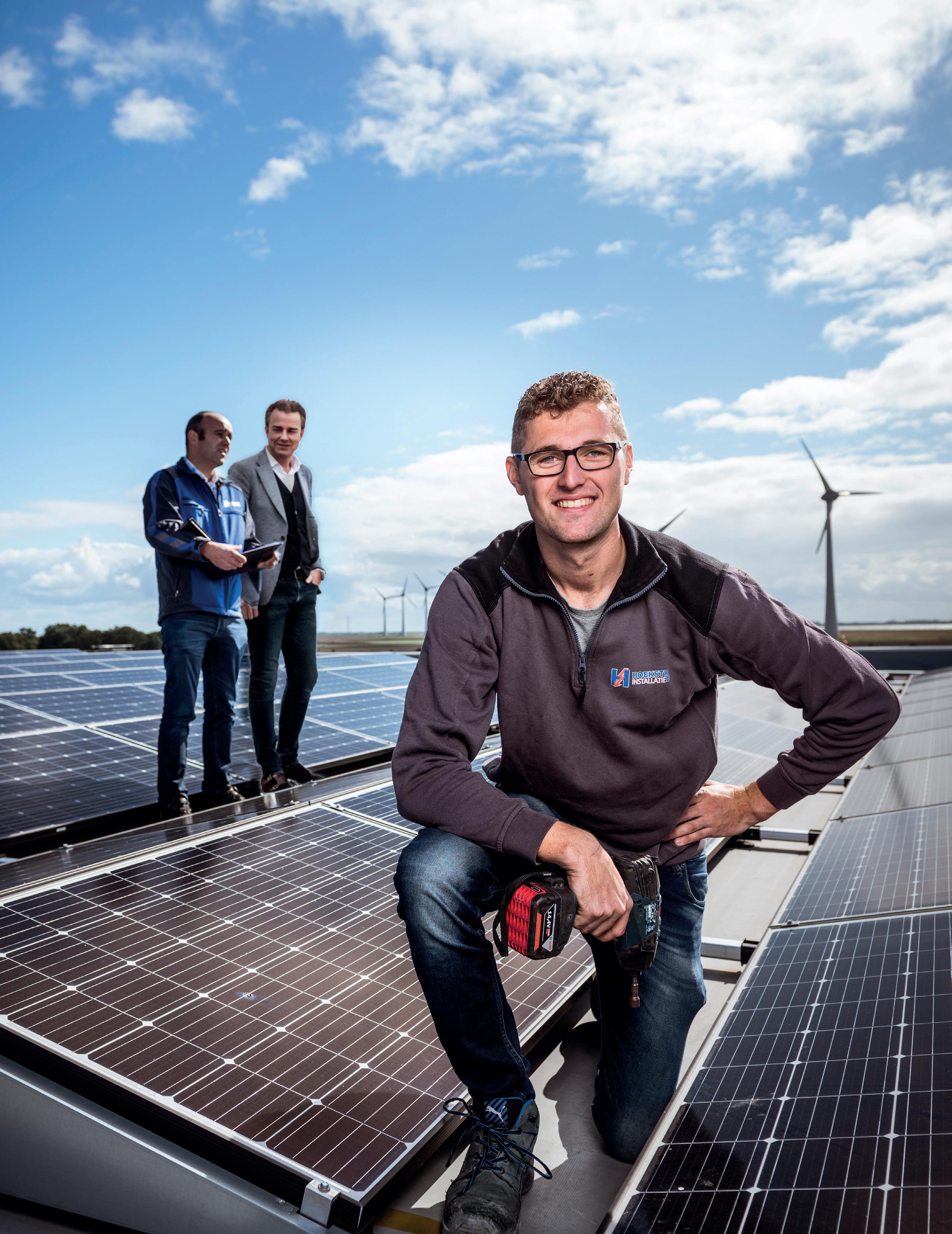 Hoe staat het eigenlijk met de tech nische ontwikkelingen op het gebied van pv-panelen? “Er wordt flink door ontwikkeld: dankzij nieuwe technie ken kun je steeds meer vermogen uit panelen halen. Een hogere efficiëntie dus, en minder warmteverlies. Ook de omvormtechnologie blijft in bewe ging. En – kijkend naar de geplande afbouw van de salderingsregeling –stijgt de vraag naar batterijopslag en accu’s. In ons land worden deze tech nieken nog relatief weinig toegepast, maar in België en Duitsland worden ze al massaal gebruikt. We leren ui teraard graag van de ervaringen die hiermee in deze landen wordt opge daan. Accu’s zijn nu in voldoende mate verkrijgbaar, maar de vraag zal flink stijgen de komende jaren. Op de achtergrond zijn we bezig ons hier op voor te bereiden.”