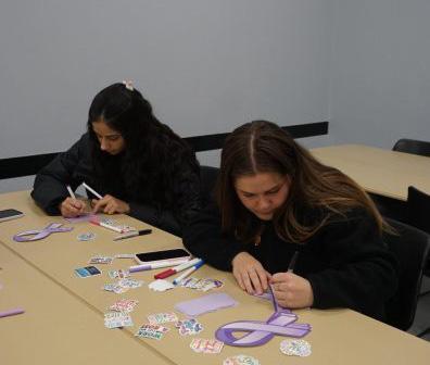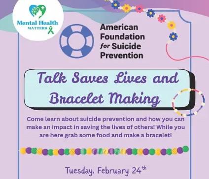Volunteer presenter with the AFSP, Laura Distelrath, spoke to students as they crafted bracelets from an assortment of colorful beads and string, while also enjoying refreshments during the presentation.