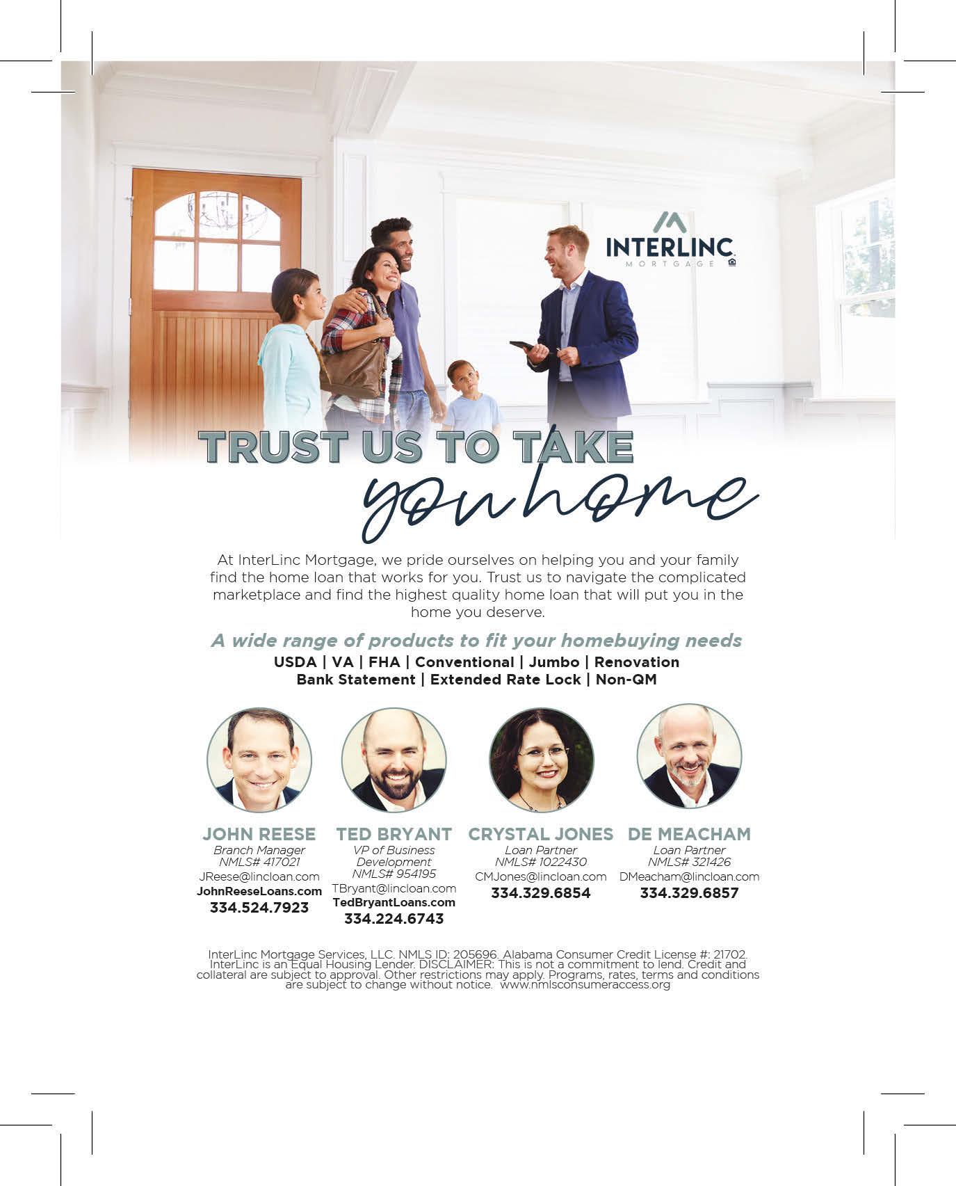 Linda Zhang Realtor® 334.734.3341 INSURANCE AND FINANCIAL SOLUTIONS SHEY KNIGHT (334) 203-4296 JEFF BRYANT (334) 444-3512 We Know Insurance! Michael Walton Assoc. Broker 334.610.6339 Morris Smith Assoc. Broker 334.740.5440 Tinker McCain Realtor® 334.748.0183 Scott Fuller Realtor® 334.737.8444 Lisa Thrift Assoc. Broker 334.444.8099 Serving Opelika, Auburn, and Lake Martin! 458 South 10th Street, Opelika, Alabama (334) 759-7525 Rush Denson Owner/Broker 205.503.8655 Page 14 October 2022
