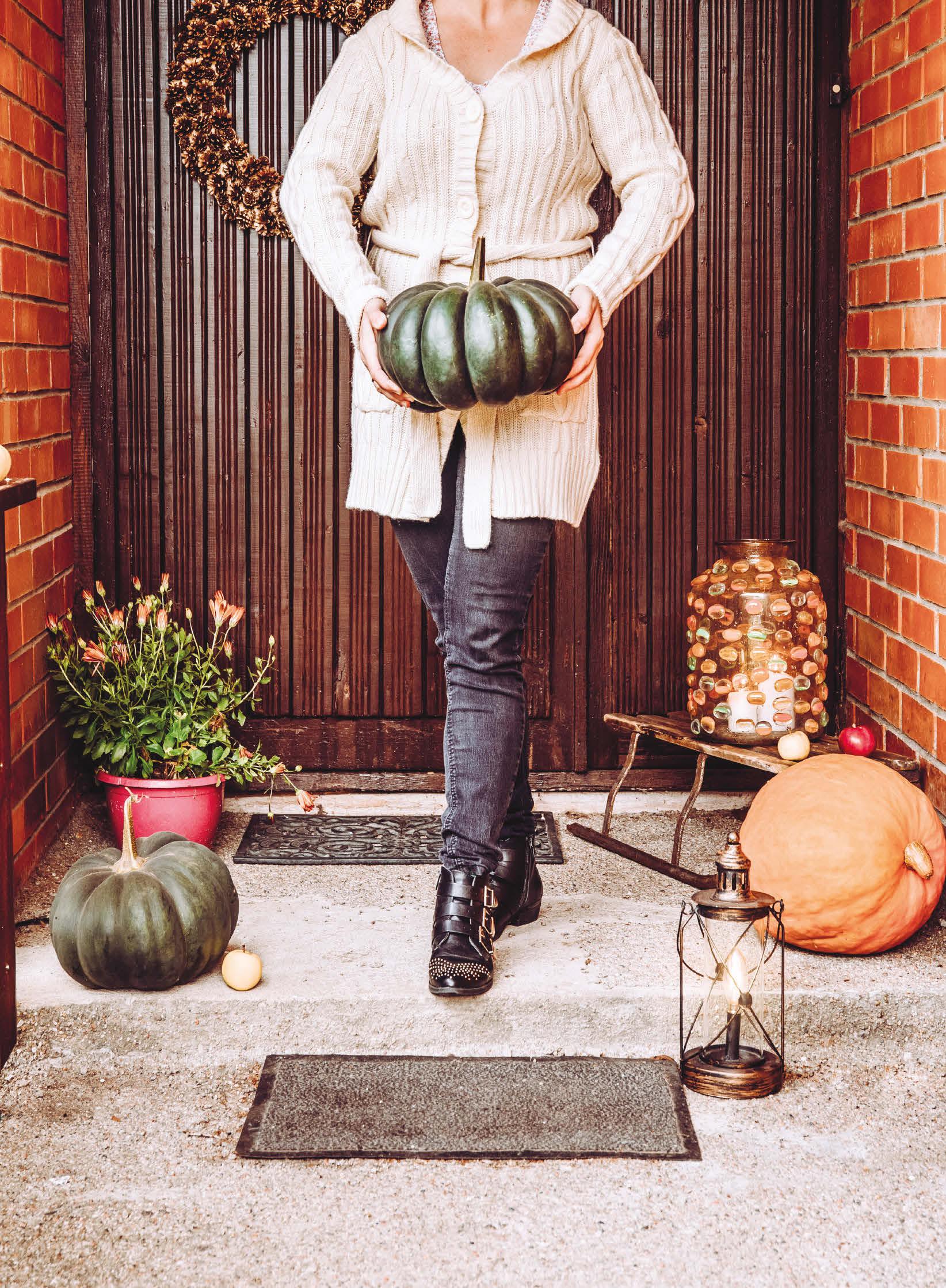 The good ol’ fashioned carved and/or painted pumpkins with a candle. Add some cute  scarecrows and some fake colored pumpkins - keeping it real and simple - I like it!