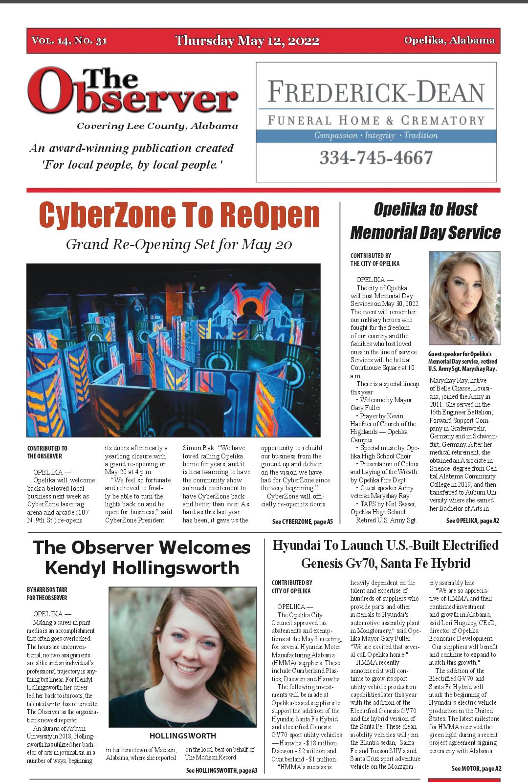 A2 Sept. 22, 2022 The Observer will correct any errors, omissions or inaccuracies deemed to be substantive. Corrections may be requested by contacting the editor at CORRECTIONS334-749-8003. LIVE LEE EDITOR: Hannah Lester MARKETING: Woody Ross PHOTOJOURNALIST: Robert Noles SPORTS EDITOR: Wil Crews SPORTS WRITER: D. Mark Mitchell STAFF REPORTER: Kendyl Hollingsworth 223-A S. 8th St., Opelika, AL 36801 Copyright 2009. All right reserved. The Observer is published weekly by Key Media LLC, 223-A S. 8th St., Opelika, AL 36801. Periodicals postage is paid at Opelika, AL. USPS #025104 POSTMASTER: Send address changes to The Observer, 223-A S. 8th St.,, Opelika, AL 36801 www.opelikaobserver.com PHONE: PUBLISHER:Michelle@opelikaobserver.comeditor@opelikaobserver.com334.749.8003MichelleKey Exp. Date: • $34 for 1 year (inside Lee County) $45 for 1 year (outside of Lee County) • City:Address:Name: State: ZIP: Phone number: Email address: The Observer 223-A S. 8th St., Opelika, AL 36801 Please do not send cash through the mail. Payment Type (circle one): Check / Credit Card Visa or Master Card # Amount Paid:Security Code:/ Return to: Subscribe to The Observer today! OOUOOOHPTCNTRIBTEDTTHEBSERVER
