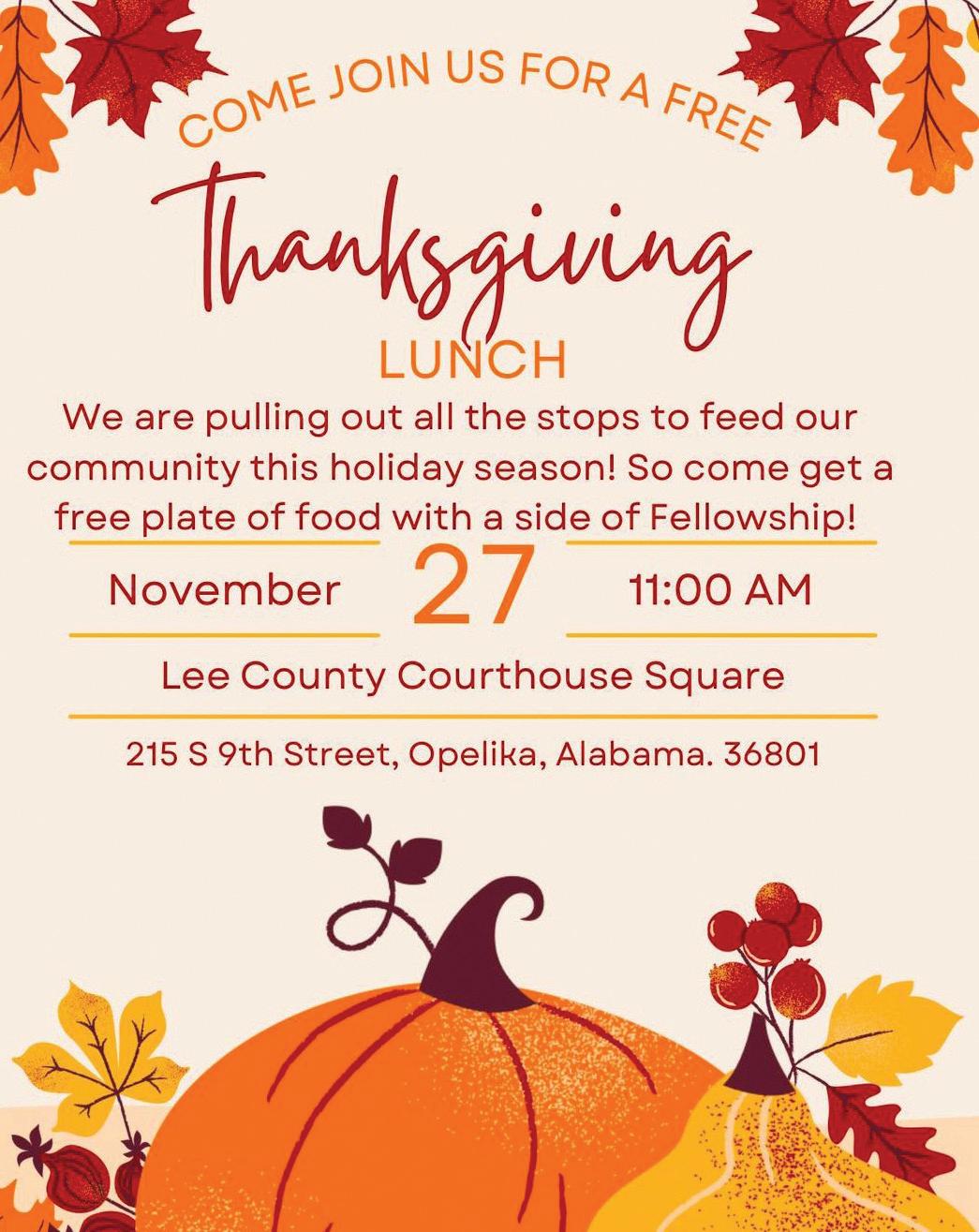 • On Monday, Nov. 11, the city of Opelika will host its annual Veterans Day Breakfast at 9 a.m. at the Opelika Public Library, located at 1100 Glenn St. Breakfast is free for veterans and their families.