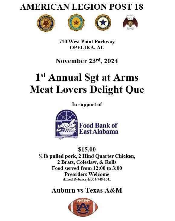 Committee will host the annual Mayor’s Veterans Day Breakfast at The Hotel at Auburn University and Dixon Conference Center at 8 a.m. Tickets for the event may be purchased at Auburn City Hall, 144 Tichenor Ave. The breakfast was created to honor the United States Military and recognize those soldiers who have made the supreme sacrifice. The public is invited to attend.