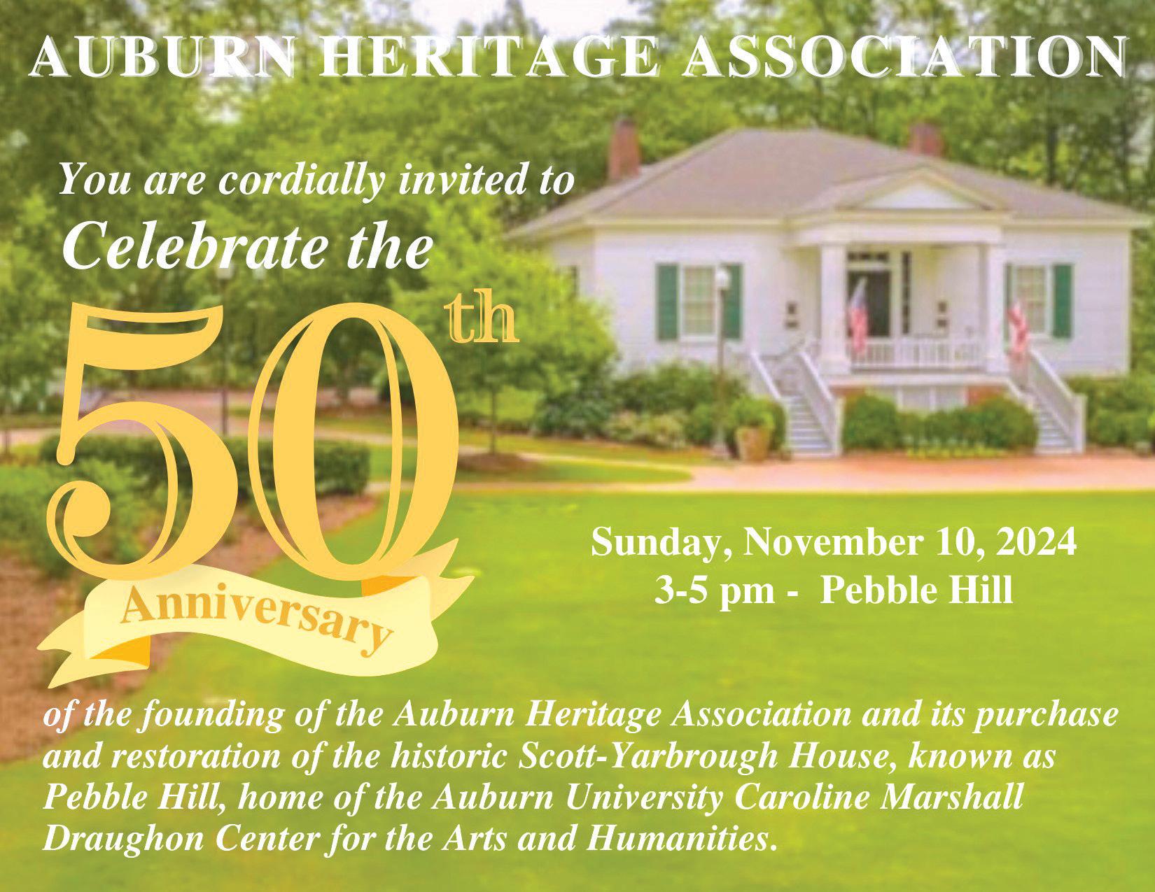 The Auburn Heritage Association will mark its 50th anniversary with an open birthday party on Sunday, Nov. 10, from 3 to 5 p.m. at the historic Scott-Yarbrough House (Pebble Hill) located at 101 S. DeBardeleben St. in Auburn. The program is free, the public is invited and refreshments will be served.