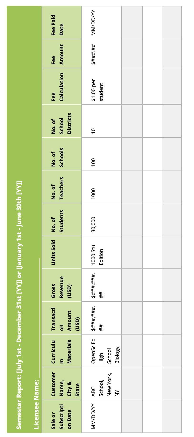 c. Reports. For each Semester during the Term, no later than thirty (30) days after the last day of the applicable Semester, Licensee will, at no cost to OpenSciEd, electronically deliver to OpenSciEd a true, accurate and complete usage and revenue report detailing Licenseeās use of the