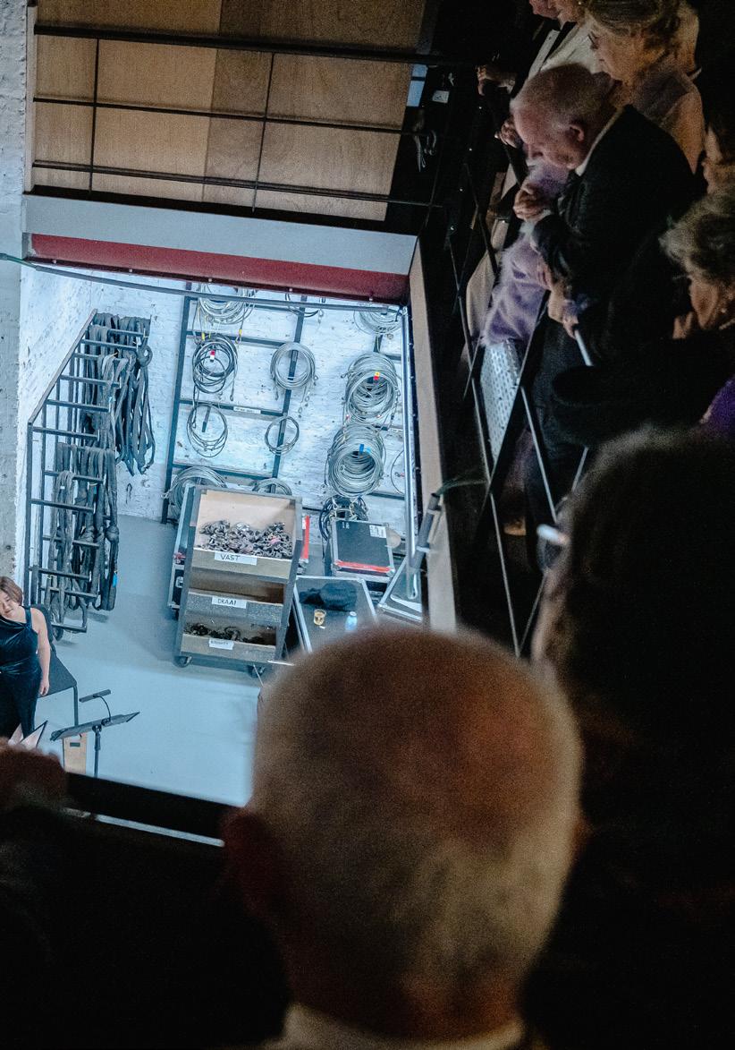 Na een welkomstwoord door Vrienden-manager Anne-Sophie Van Vyve en een speech van algemeen directeur Jan Raes begint het meest avontuurlijke luik van de avond. In groepjes worden de Vrienden en Ambassadeurs door een ervaren gids meegenomen op een (voorlopig laatste) tocht door het Gentse operagebouw. Wij sluiten aan bij het gezelschap onder leiding van Laura Van Slooten, de event coördinator van OBV. Ze neemt ons meteen mee naar de theaterzaal, waar we getrakteerd worden op een mini-dansvoorstelling door OBVdanseres Allison McGuire. Het is maar een van de vele artistieke amuses die we op onze tocht voorgeschoteld krijgen.