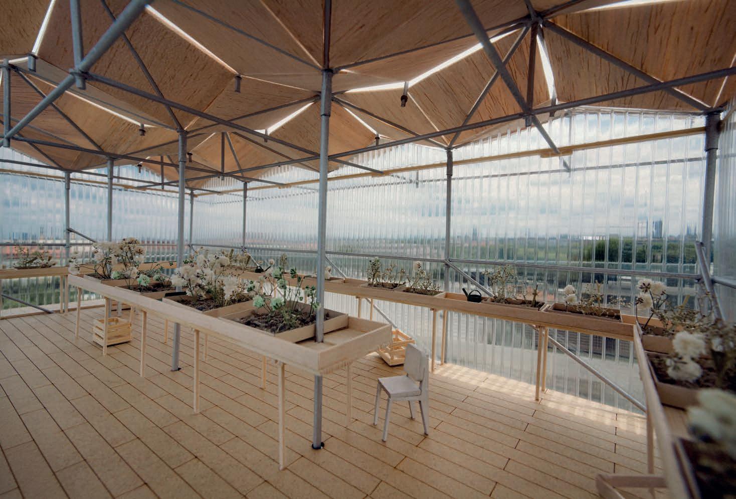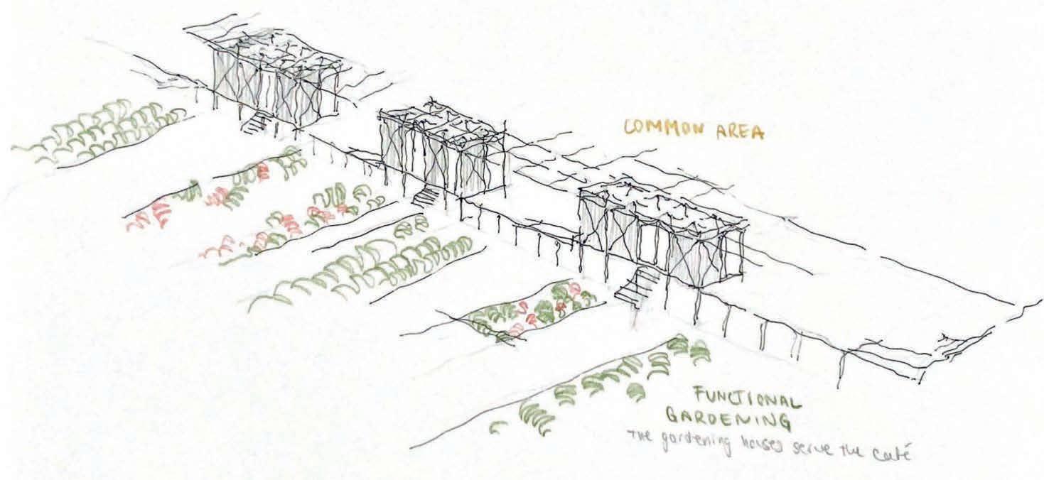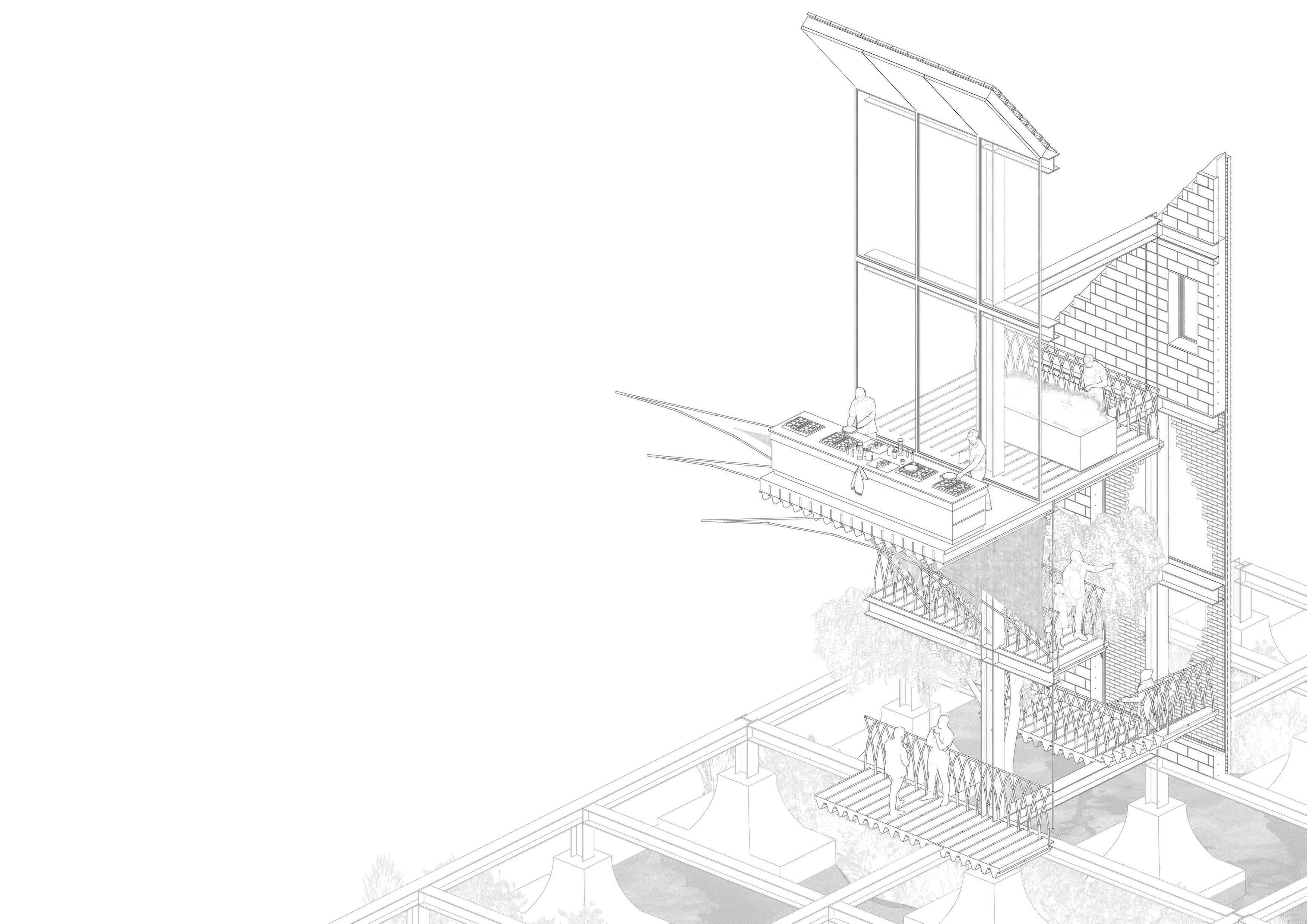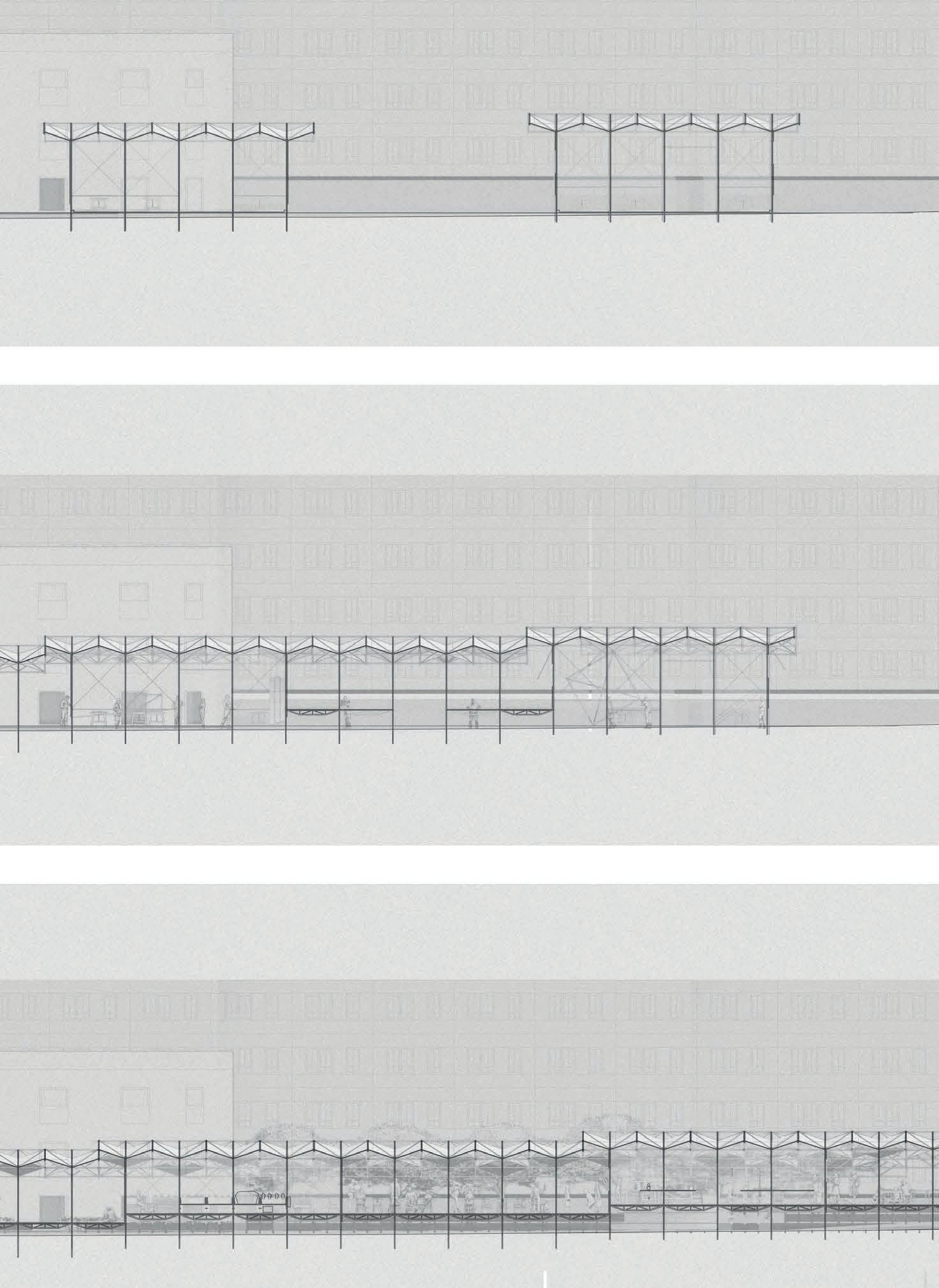 current buildings as roof a truss, forming an urban canopy that will stretch out towards the street. Effectively, by using their job specific education the homeless are building their way back into the society of Freiham (social reintroduction). The level difference between the street and the and the platform is managed by a series of four timber platforms. The large length of these platforms compared to the height difference links the homeless shelter to the street in a very subtle way so it feels like you are almost walking along the same street.