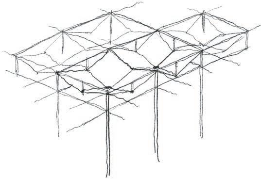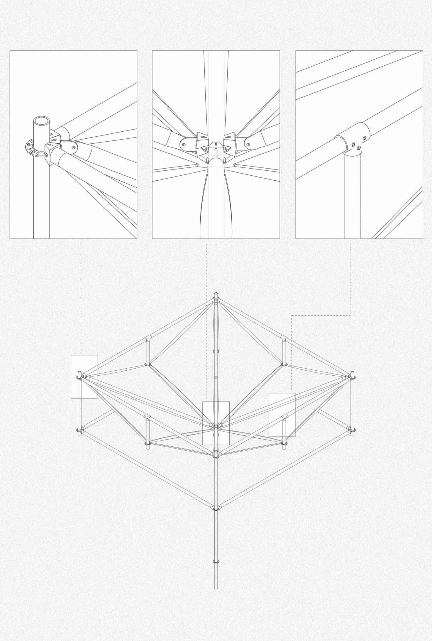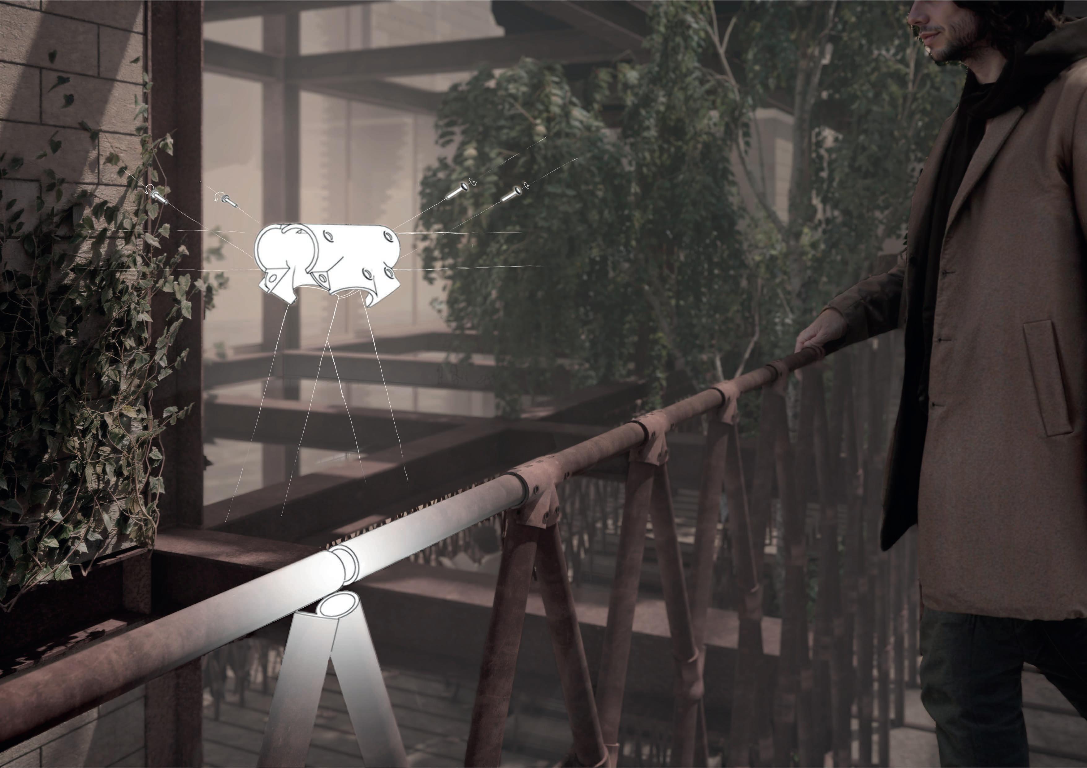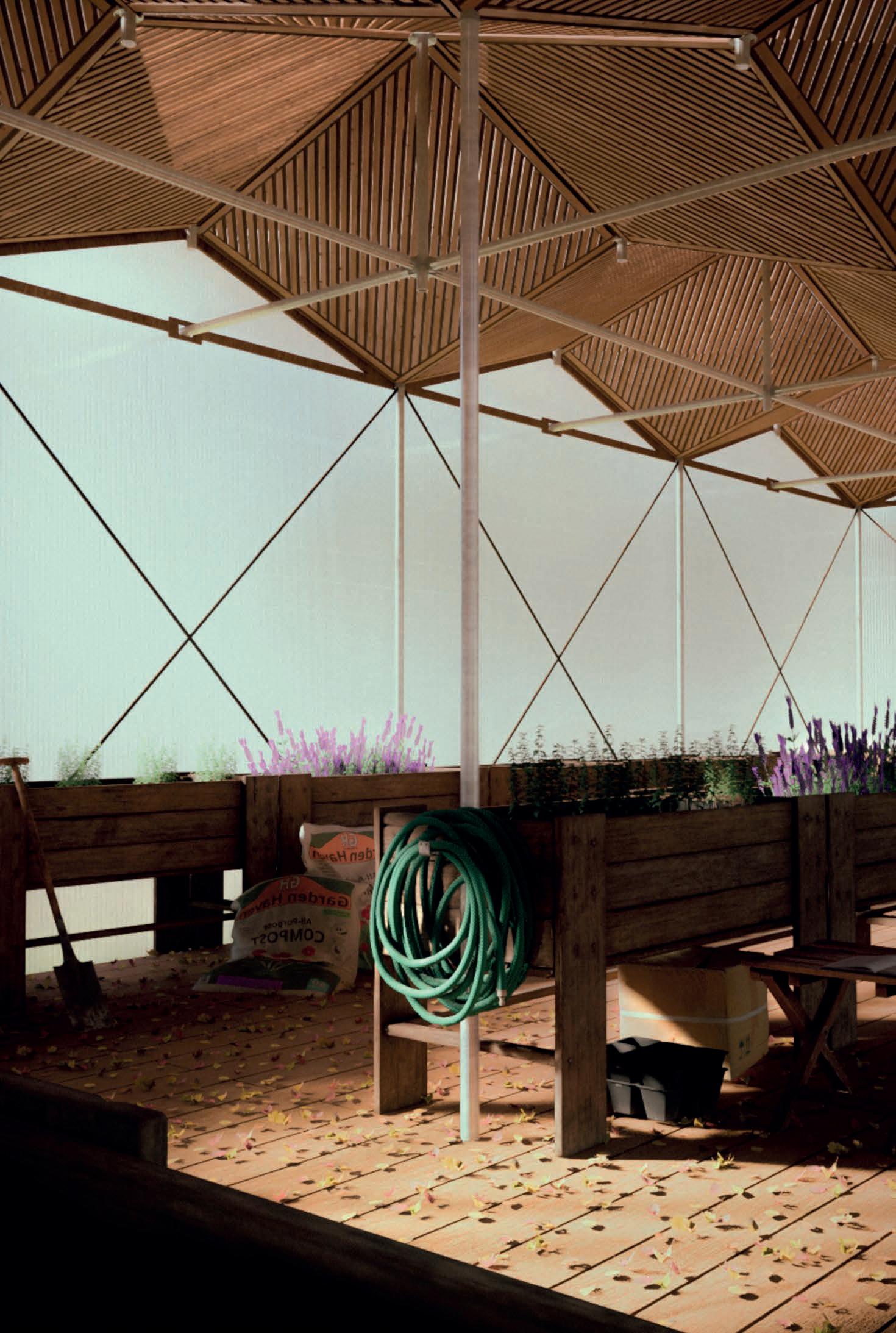 In Phase 02 these buildings will act as participatory workshops. In these workshops, residents of the homeless shelter will be taught how to construct this: ‘a single flower module’. In the construction of one module, every type of scaffolding joint type is used,hence its shape. This means that by the end of their summer workshops the homeless can become fully qualified to become scaffolders (relating to job specific education).This is why we have chosen scaffolding as our structure material, there are very few techniques to master so they can all be used in one module.
