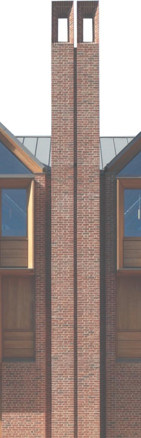 The walls are laid in English Garden Wall bond and the chimneys are laid in Flemish bond to reflect their load bearing nature. The different formations contribute to the strength of the columns as well as the aesthetic relationship to the other buildings. One of the challenges of the building was to make a long lasting construction, able to withstand weathering and serve multiple generations.