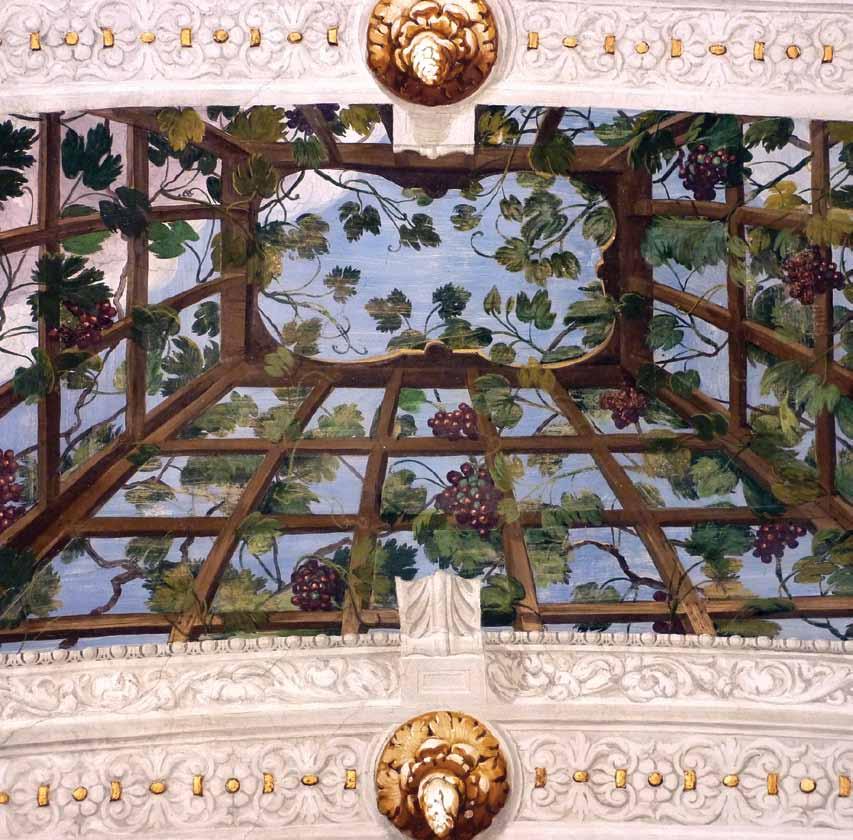 Pictured is a detail of the vault in the Room of Bacchus, painted by Paolo Veronese (1528-88). It portrays a trompe l’oeil with a vine that is growing towards the sky, while the rich bunches promise an abundant and exquisite harvest
