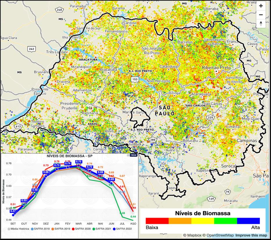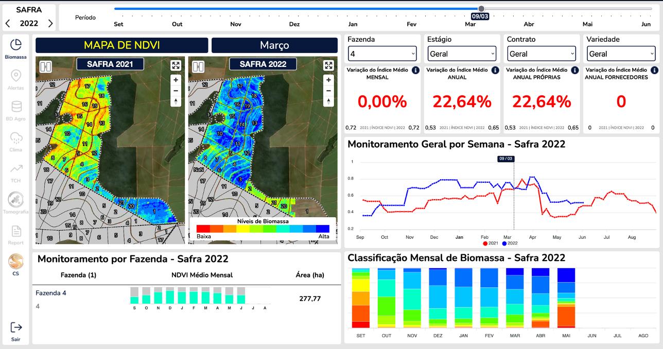 de biomassa – NDVI (Índice de Vegetação por Diferença Normalizada), umidade presente na folhas NDWI (Índice de Diferença Normalizada da Água) de cada talhão, fazenda, apontando a curva de evolução ou involução do canavial e suas tendências de produção final - TCH e ATR. Os gestores agrícolas andam em campo com seus celulares em mãos, alimentadas com imagens recentes de satélites interpretadas com a tecnologia NDVI, indicando os níveis de biomassa de cada talhão, alertas de áreas do 1º ao 3º corte com baixas produtividades, presença de ervas daninhas, falhas, áreas suspeitas com pragas de solo, fácil identificação dos blocos de colheitabilidade, fotos georreferenciadas das anomalias cuja equipe a própria plataforma distribui, além da facilidade de definir os blocos de reforma (analises de NDVI das áreas candidatas a reforma).