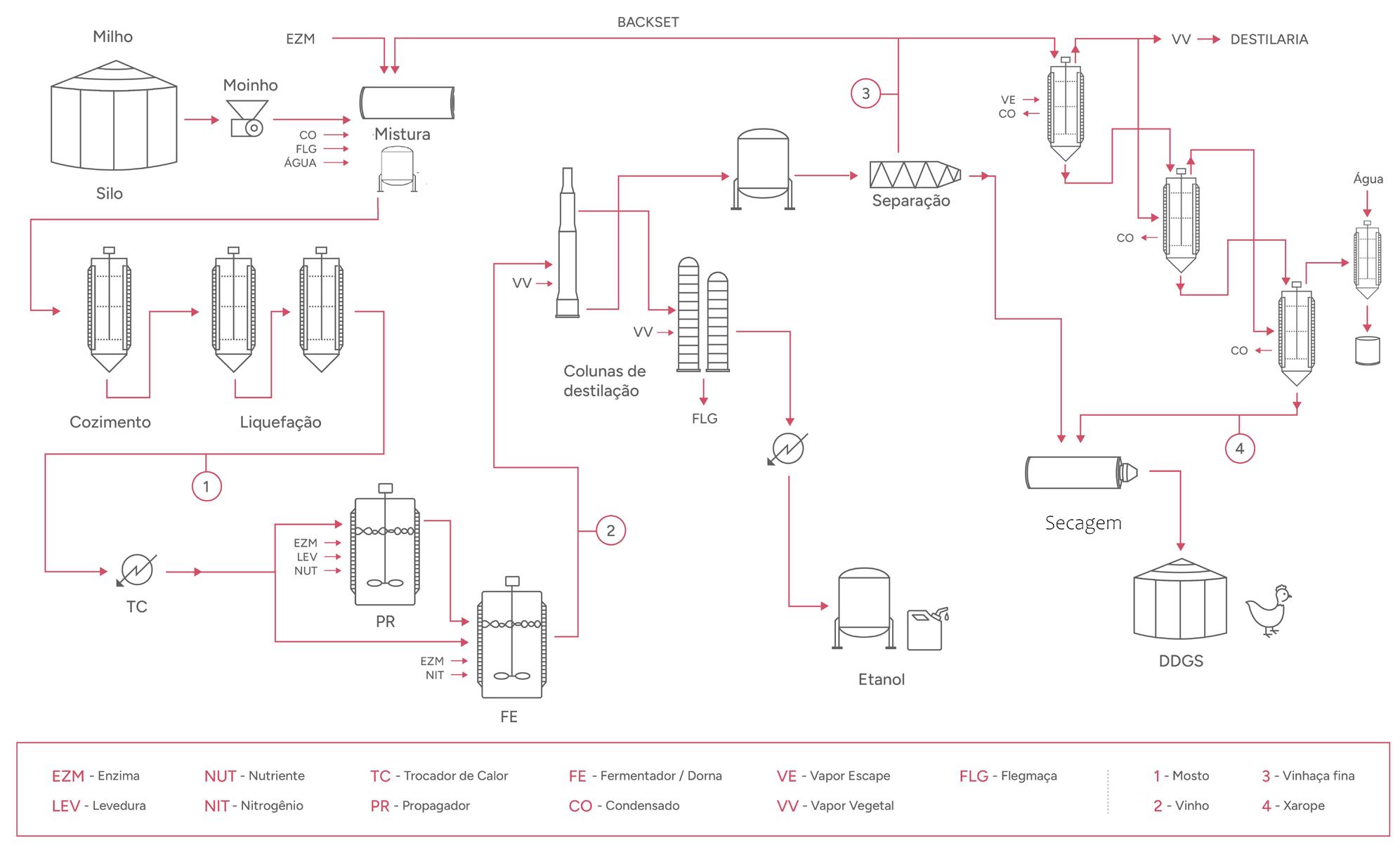3. Fibra: Utilizada para produzir dois produtos: o FS Ouro (DFS – Dry Fiber with Solubles), com alta energia, 18% de proteína e 10% de umidade, e o FS Úmido (WFS – Wet Fiber with Solubles), com 20% de proteína e 60% de umidade. Estes produtos são altamente produtivos nas dietas de ruminantes, oferecendo uma solução completa para confinamentos e sistemas intensivos de produção a pasto, reduzindo custos, simplificando a operação e aumentando a produtividade.