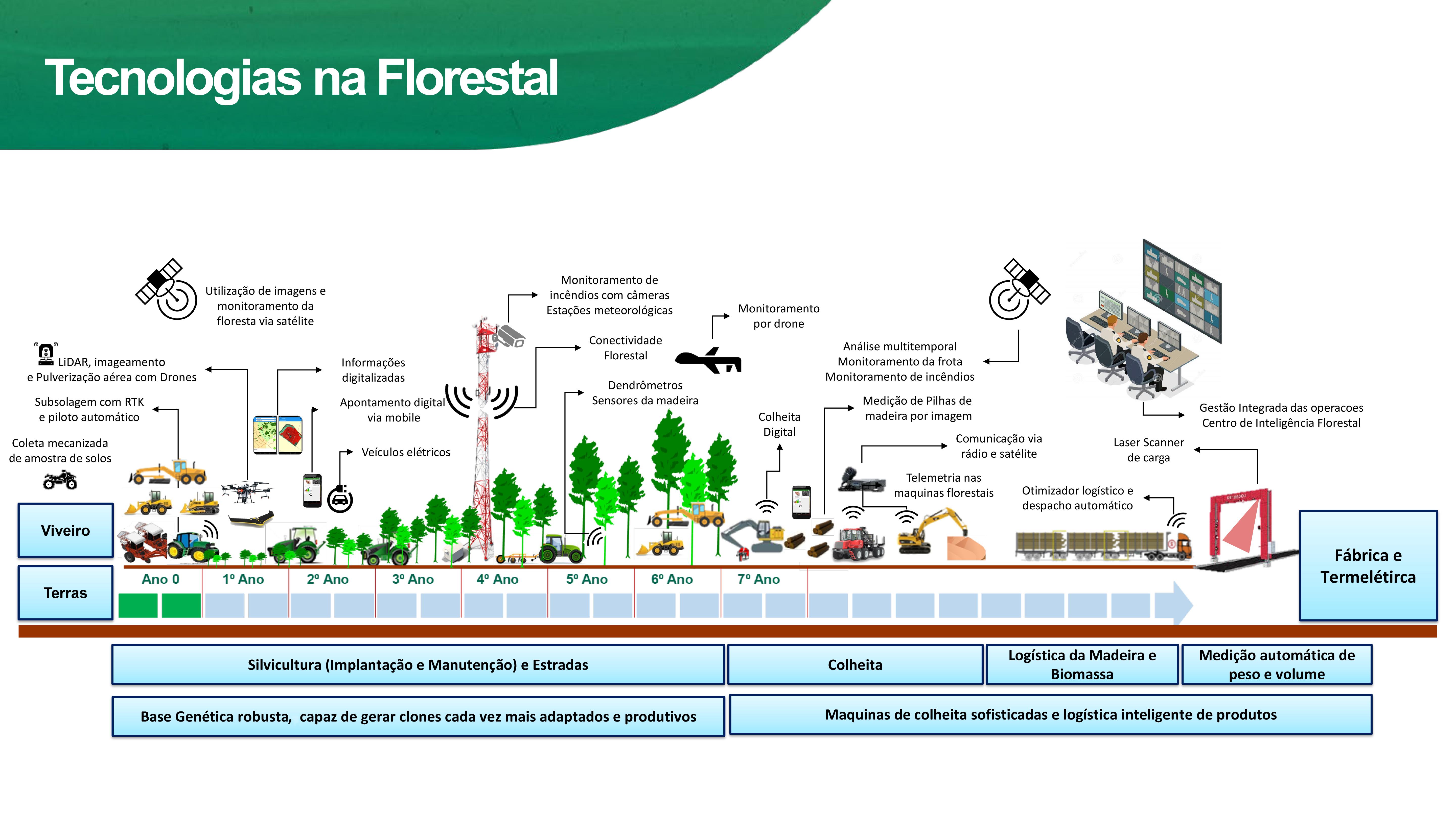 A área de colheita absorveu a tecnologia escandinava, introduzindo harverters, forwarders, skidders e clambunks, saindo de uma atividade que utilizava como base motosserras, descascadores, autocarregáveis e caminhões com baixa capacidade de carga. Quando falamos da implantação de florestas, essa atividade segue os passos do processo evolutivo e tecnológico ainda da agricultura, que, por sua vez, sempre está um passo à frente quando falamos de inovação.